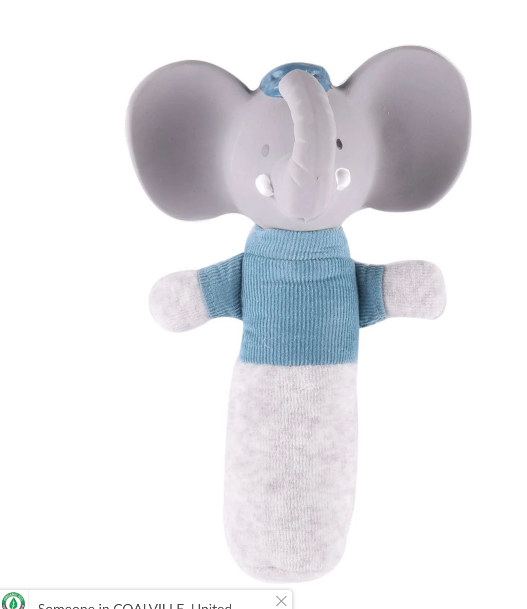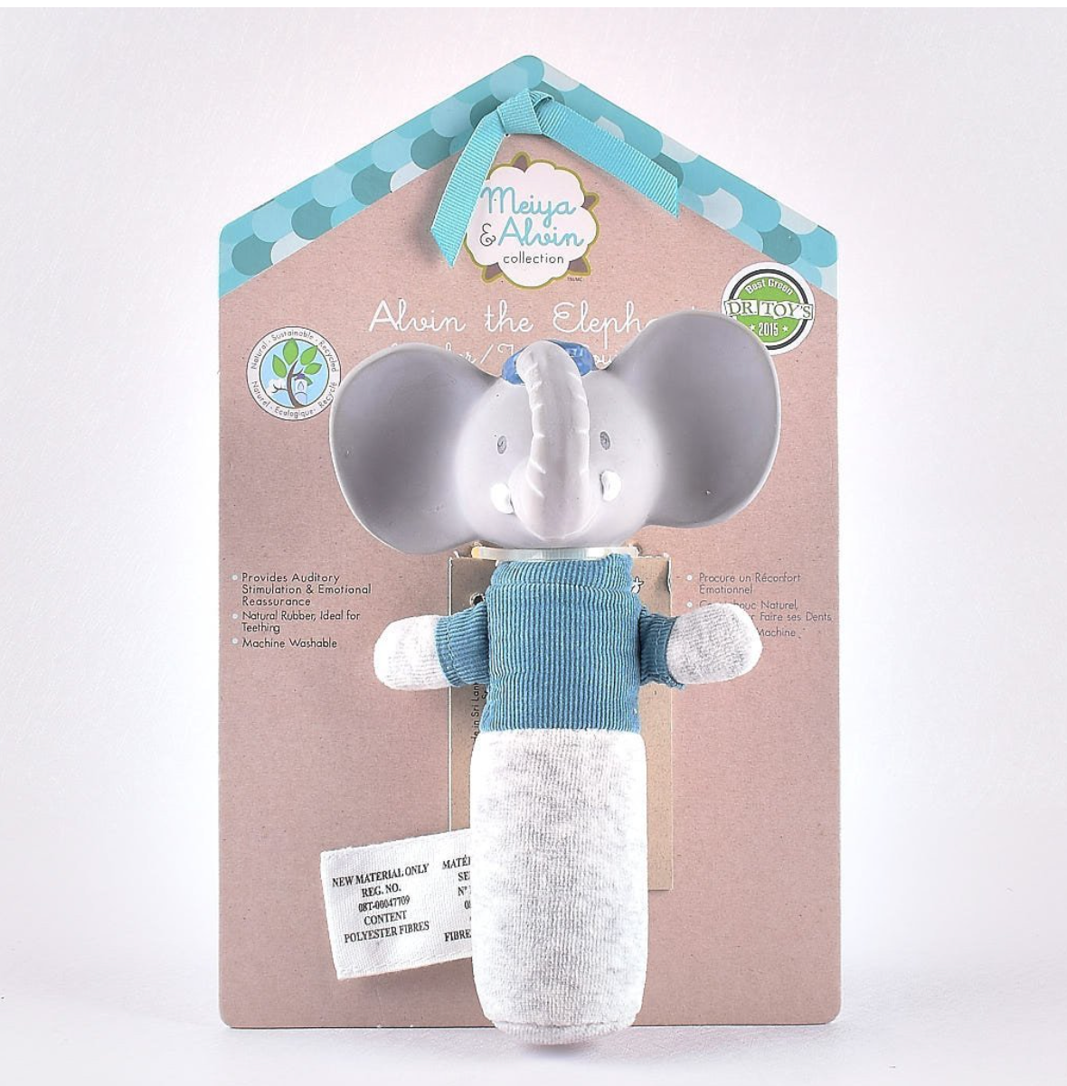 A organic natural rubber head joined with a soft fabric body with squeaker, this Alvin toy is not only easy for little hands to grip, it combines the benefits of sound toys, with a comforting character, with a toy ideal for teething babies.