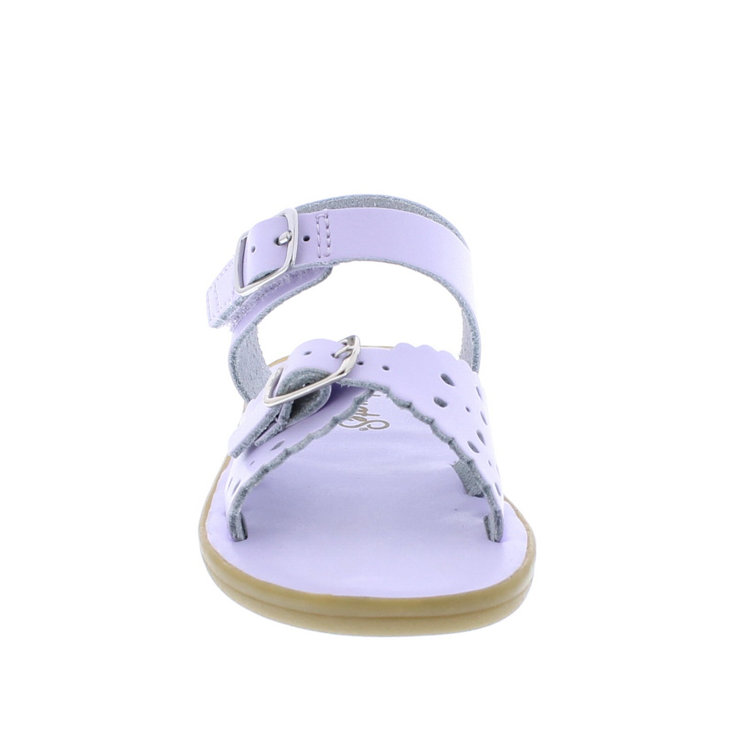 Open-toe, open-heel microfiber sandal featuring true-buckle forefoot strap and hook-and-loop ankle strap with decorative buckle.