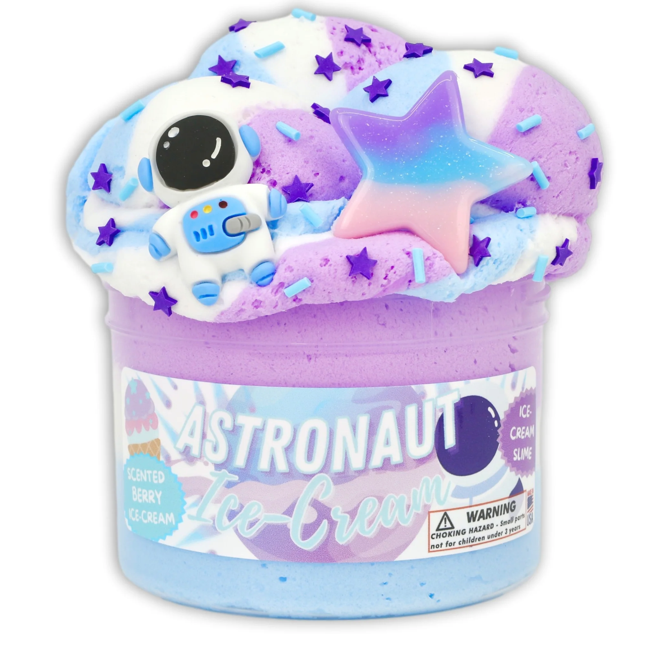 Tri-colored layered ice-cream textured slime! Topped with jumbo star charm, adorable astronaut charm w sprinkles & has a soft, dreamy and stretchy texture. Mixes into a soft violet color and is scented just like astronaut ice cream -- a sweet berry scent!