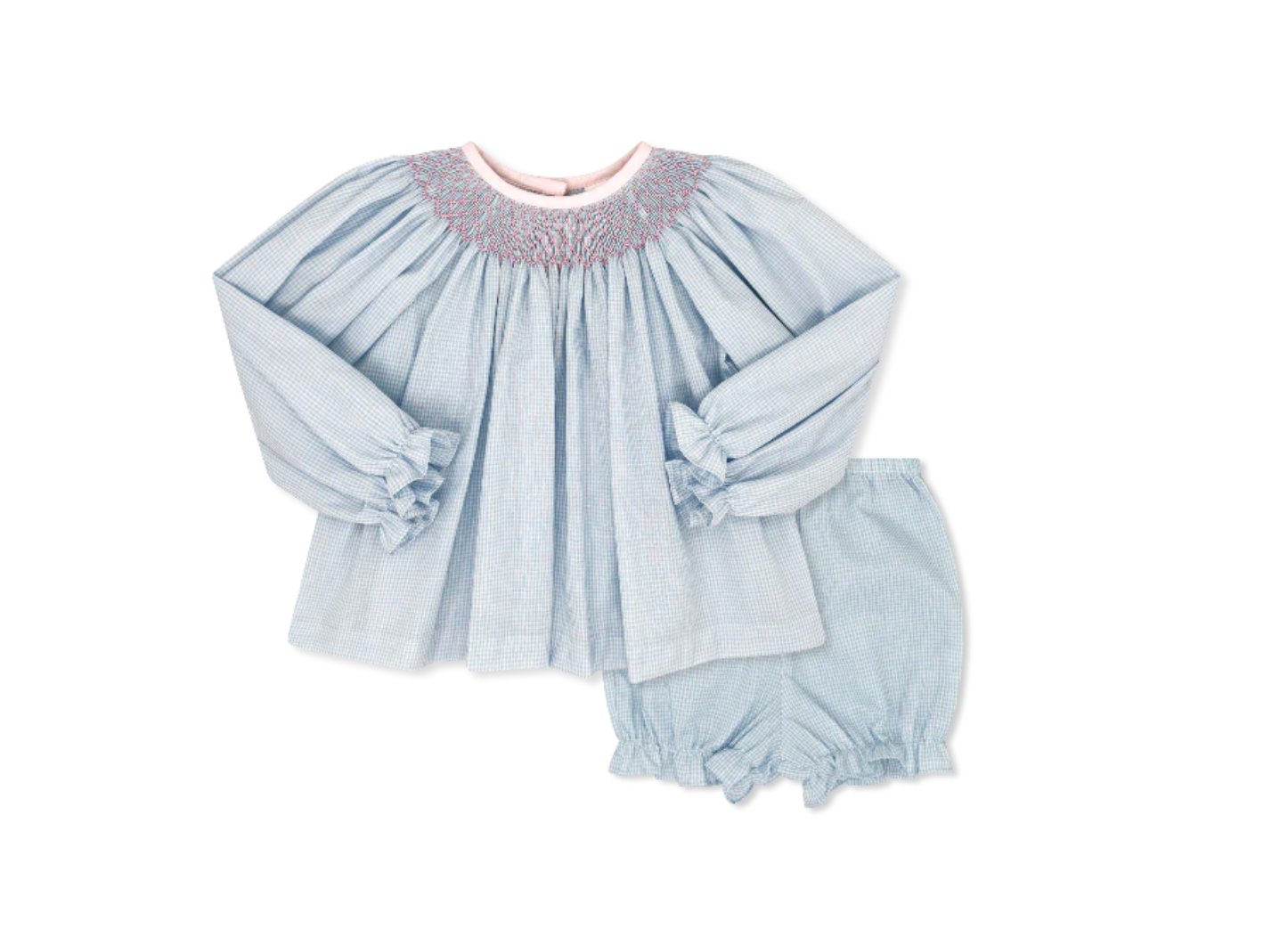 The Betsy Bloomer Set is as sweet as it is cozy, featuring our Baker Blue Minigingham. Delicate light pink welting and hand-smocked detail add a classic touch to this seasonal favorite—perfect for chilly days and picture-perfect moments.