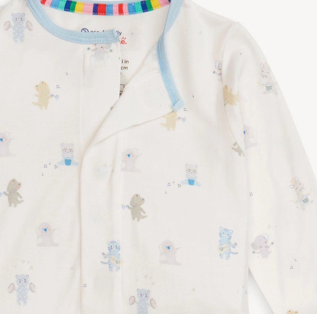 - Magnetic closures: magnets line the seam from the neck to upper thigh for sizes up to 0-3m & from neck to crotch for sizes 3-6m and up.