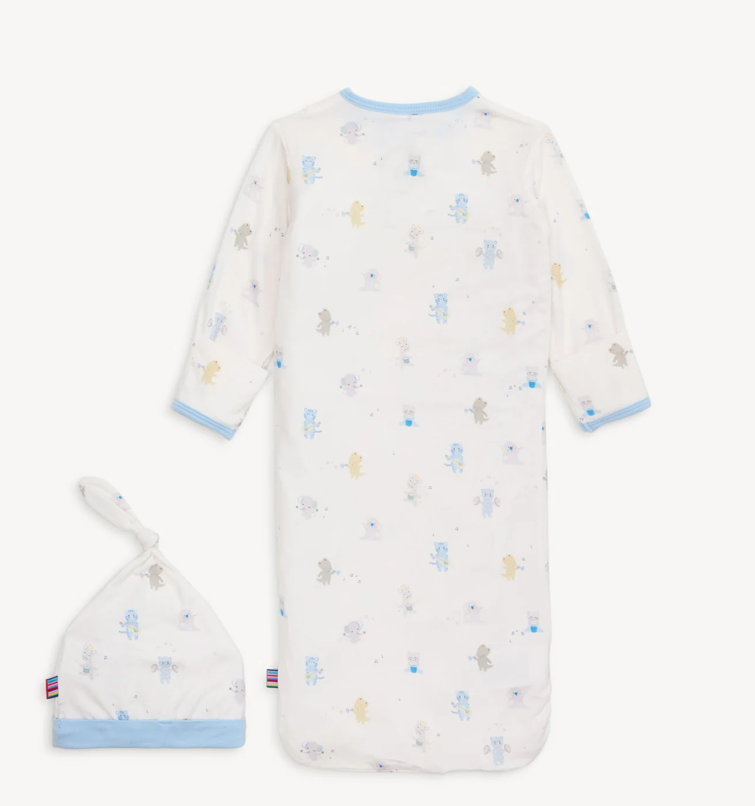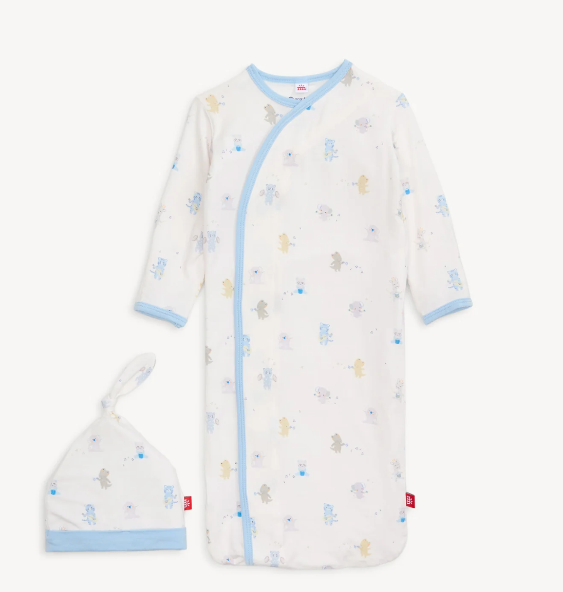 Our modal Gown & Hat Set is a newborn, late-night must-have. Magnets take diaper changes to a new level of fuss-free efficiency, while a closed bottom keeps toes and feet warm and cozy—which is mission critical during your third middle-of-the-night change. Other amazing features include the silkiest, softest modal fabric and built-in mitten cuffs.