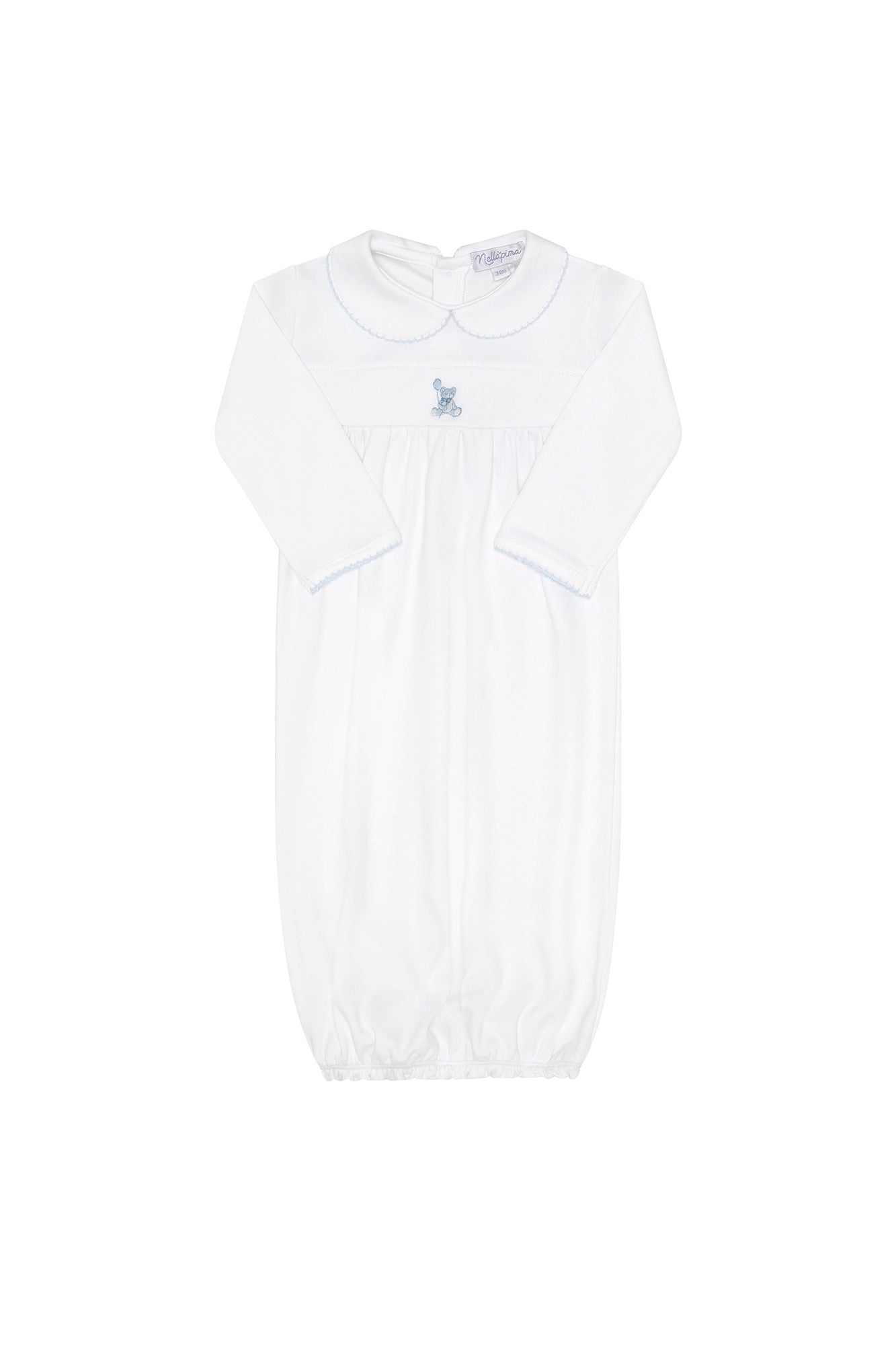 Introducing our delightful White Gown with Blue Bear Embroidery – a bundle of cuddly charm designed to make your baby's early moments even more special. Crafted with love and attention to detail, this gown features an adorable blue bear embroidery and a touch of playful blue picot trim on the neck, creating a picture-perfect ensemble that's ready to captivate.