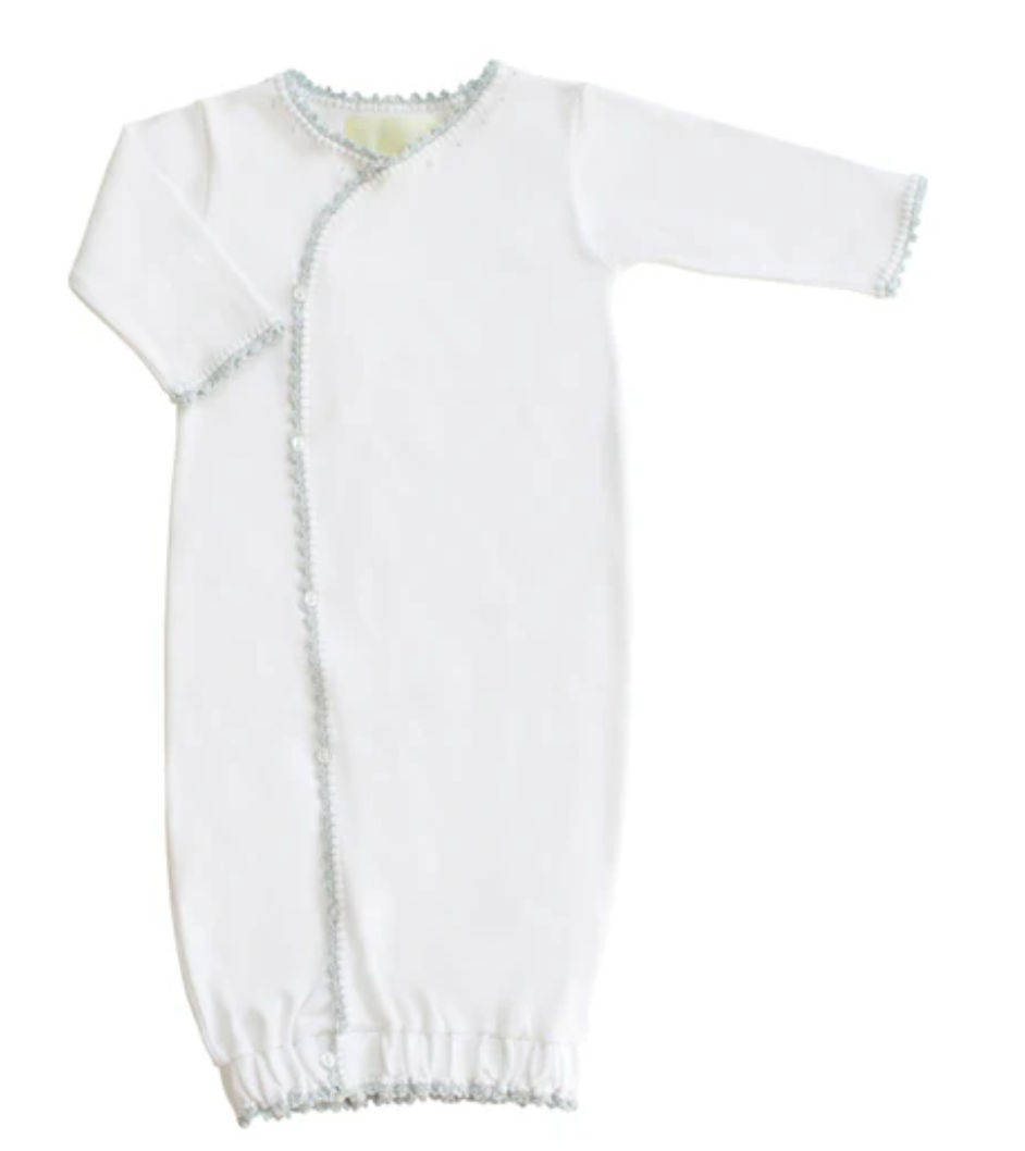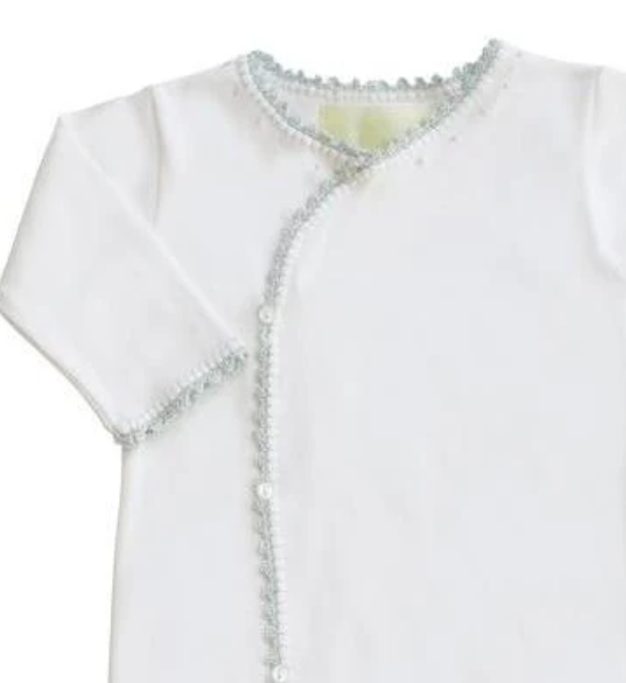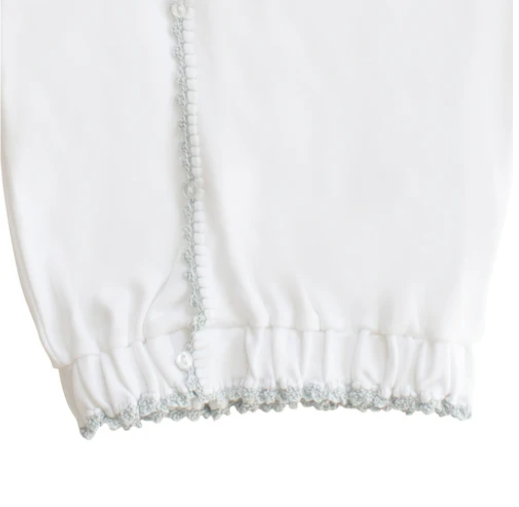 Wrap sack buttons down the front and is elasticized at the hem. It is accented with french knot embroidery and crochet trim.