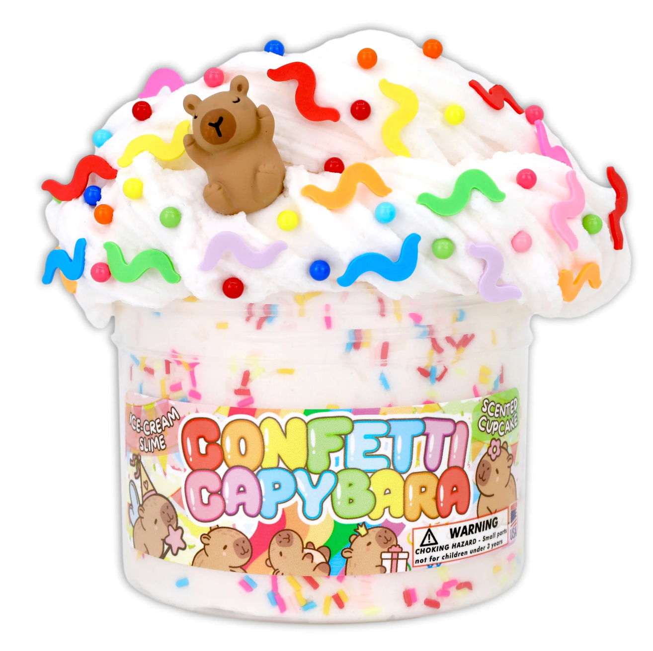 Get ready to party with confetti capybara! this fun-tastic soft and dreamy ice cream slime is rolled with birthday cake sprinkles & scented cupcake! includes a cute capybara charm and rainbow confetti shaped fimos!