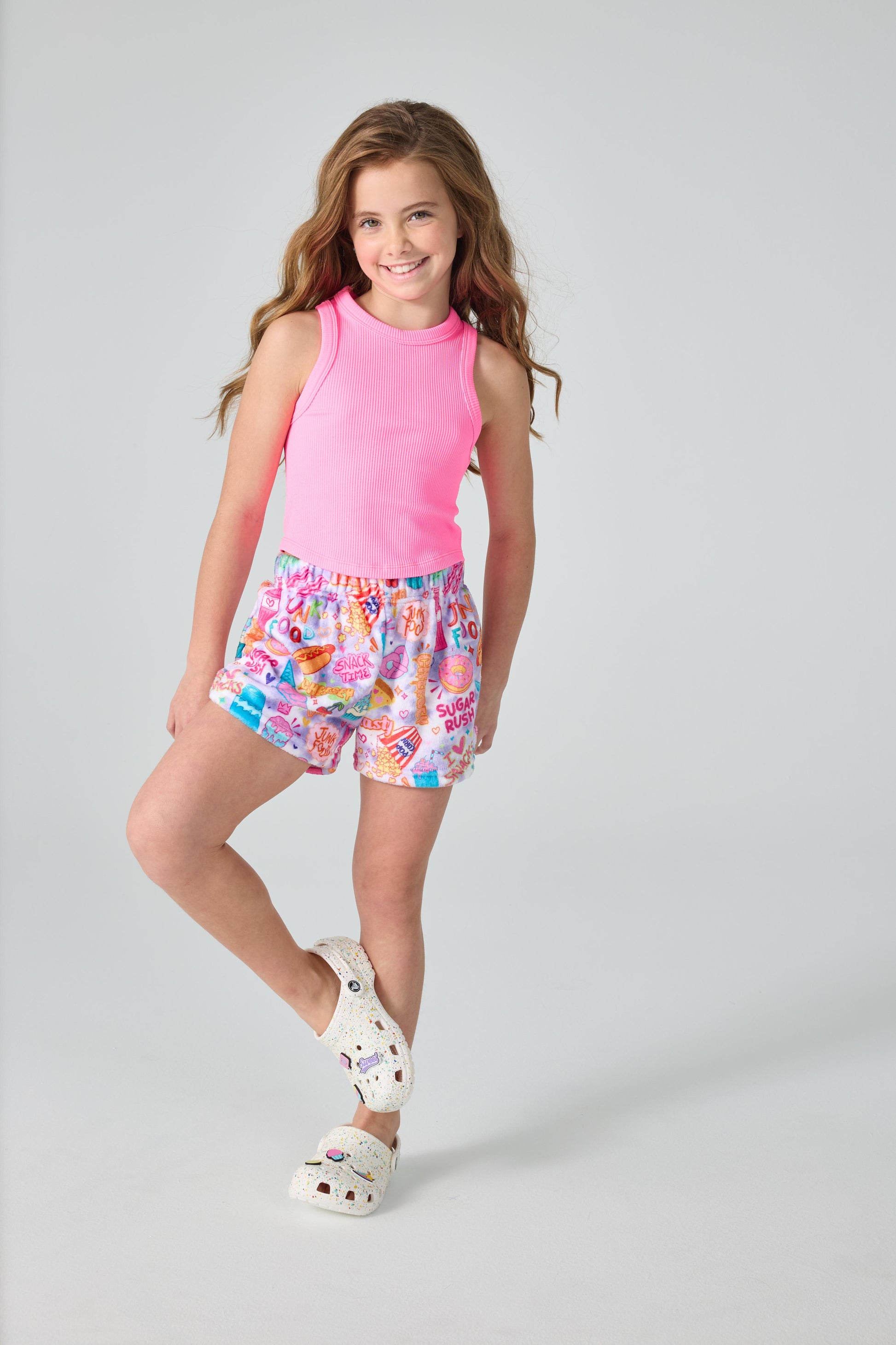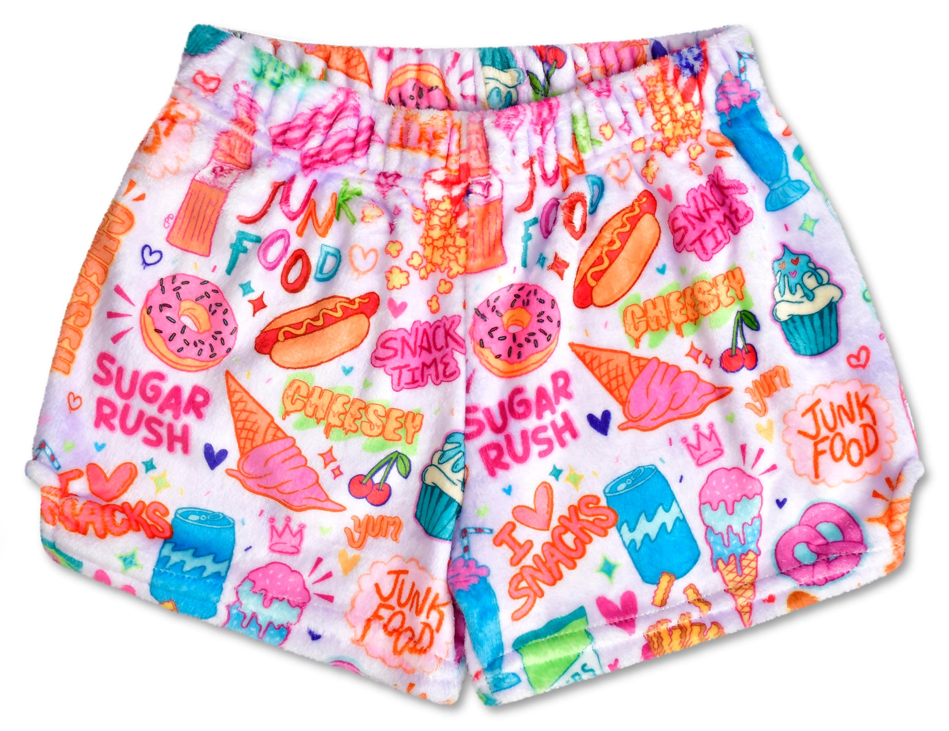 These are playful, novelty lounge or sleep shorts featuring a vibrant junk food-themed print. The background is white, and the design is covered in colorful illustrations of various treats like donuts, ice cream cones, hot dogs, milkshakes, pretzels, popcorn, and candy. Alongside the images are fun phrases like “Junk Food,” “Sugar Rush,” “Cheesey,” “Snack Time,” and “I Love Snacks” in bold, cartoon-style lettering.