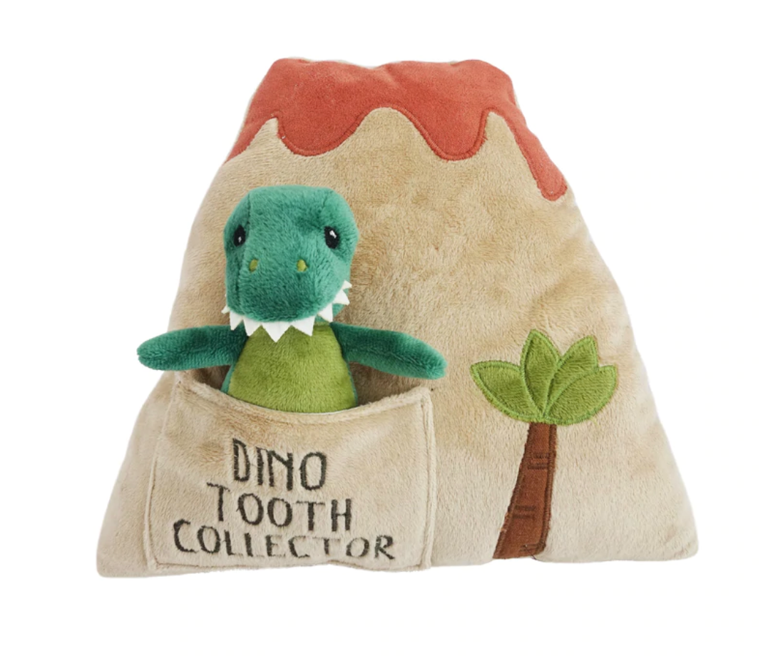 If you want to protect a lost tooth, call in the dinosaur! Mon Ami’s latest tooth fairy pillow centers around Dino Island where a fiercely adorable dinosaur plush toy stands watch over lost teeth. Store the tooth in a handy pocket of the tooth fairy pillow shaped like a volcanic island. When the dinosaur plush toy sees the tooth fairy coming, he’ll grant her entry so she can swap the tooth for a treat.
