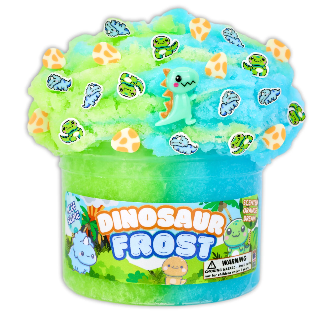 Dinosaur Frost is a soft & dreamy icee slime, duo colored green and blue that mixes into a tropical teal color! scented orange creamsicle and includes a dinosaur charm & custom shaped dinosaur sprinkles!