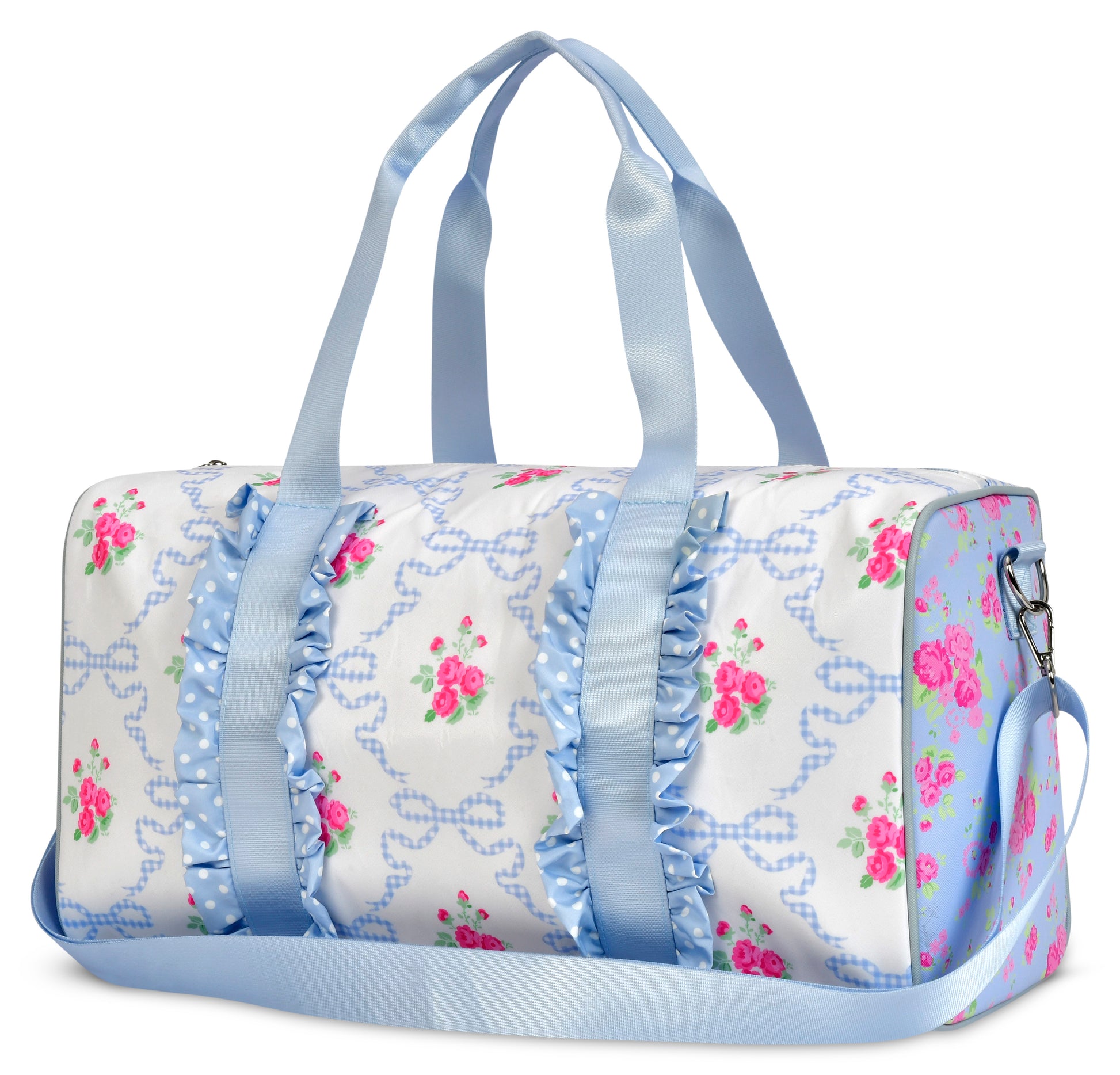 Notably, the bag is adorned with vertical ruffles made from a blue satin and polka-dot ribbon, adding a playful and feminine detail. The overall look is sweet, nostalgic, and perfect for a weekend getaway, dance class, or as a statement travel accessory.