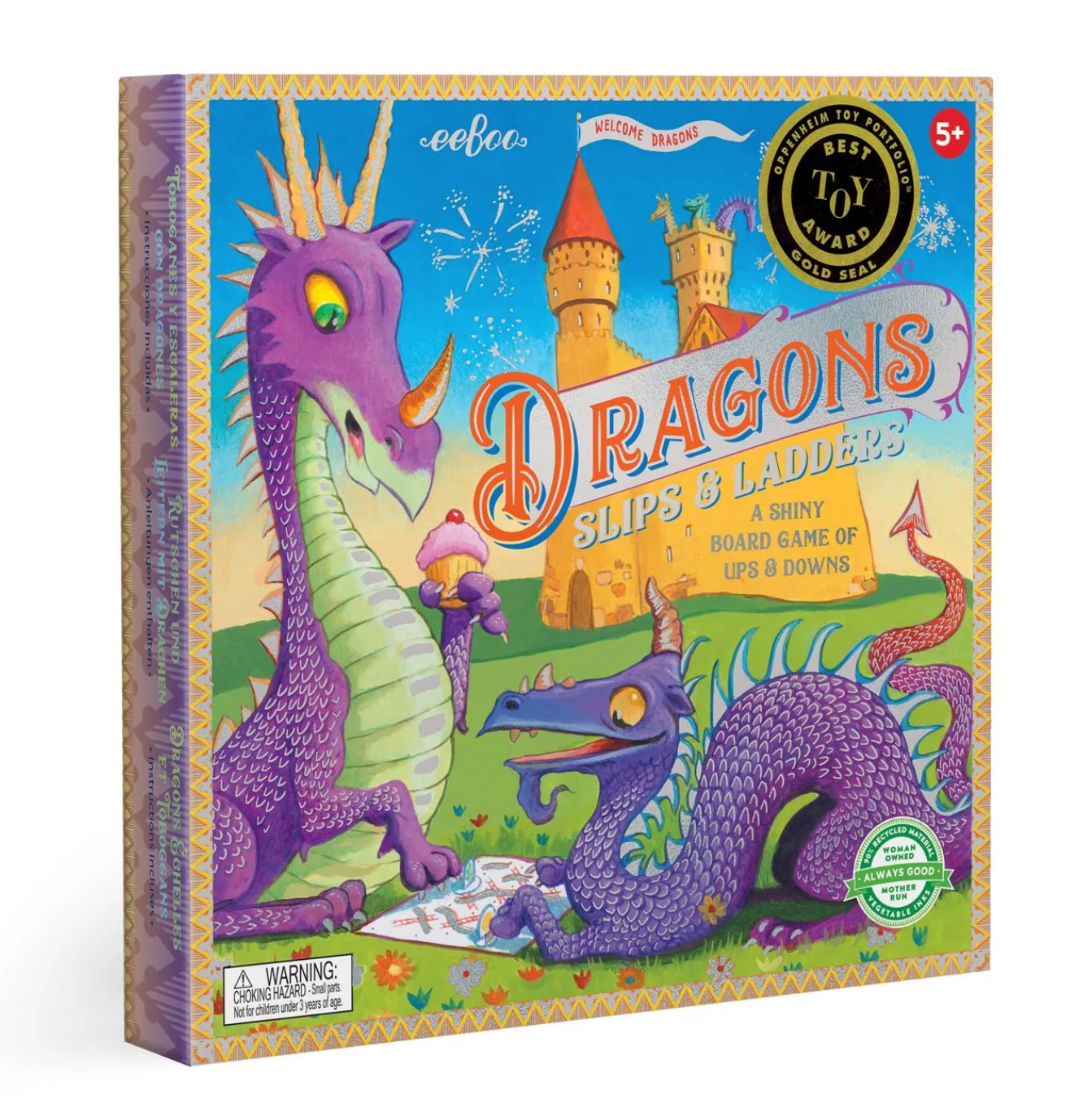 eeBoo reimagines the classic game of Slips and Ladders with the whimsical illustrations of illustrator Kevin Hawkes and a celebratory measure of gorgeous shiny holographic foil for the Dragon party that players are trying to reach at the top of the castle. Land on a slide and slip back down to a lower square; land on a ladder and climb closer to the finish line!