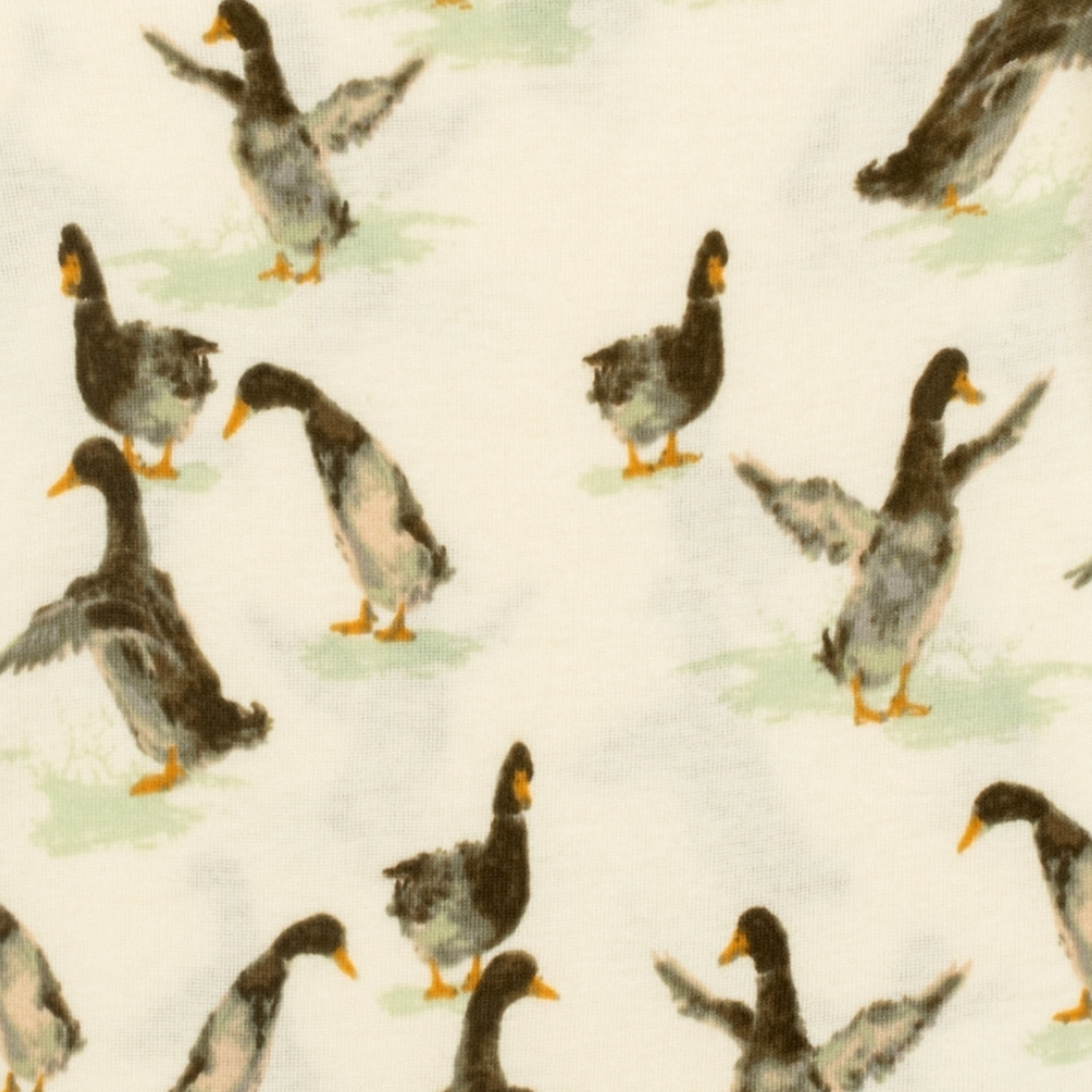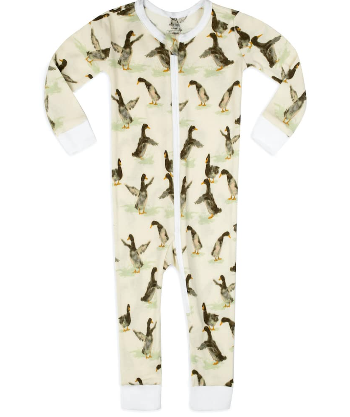 Our extra soft organic cotton Zipper Pajama in the Duck print blurs the lines between sleepy time, playtime, and cuddle time. The open foot detail allows our little ones greater mobility, while the midline, neck-to-knee zipper provides ease and flexibility of changing. Added details include a crew neckline, contrasting wide-band cuffs, and a stylized fabric zipper tab cover. We package each pajama in a reusable, corresponding fabric drawstring satchel ideal for baby essentials such as diaper wipes and up to four diapers.