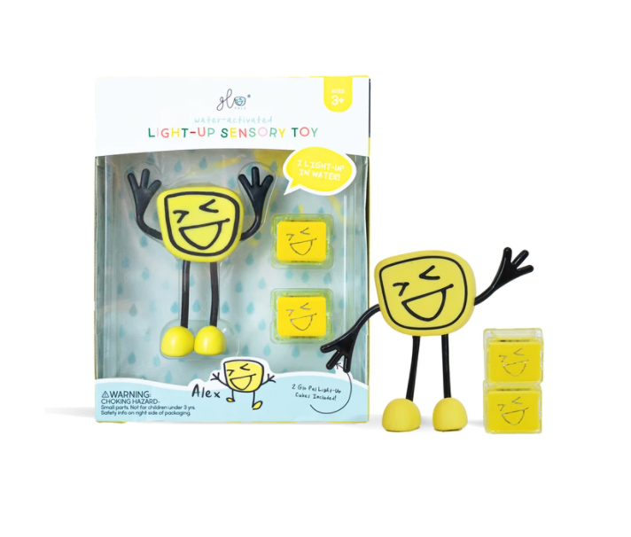 Insert your Glo Pals Light-Up Cube into the back of each Pal, drop it in the water, and watch it light up! Featuring bendable arms and colorful personalities, each Pal proudly illustrates the uniqueness in every child! Alex comes with two Glo Pals Light-Up Cubes included in the box!