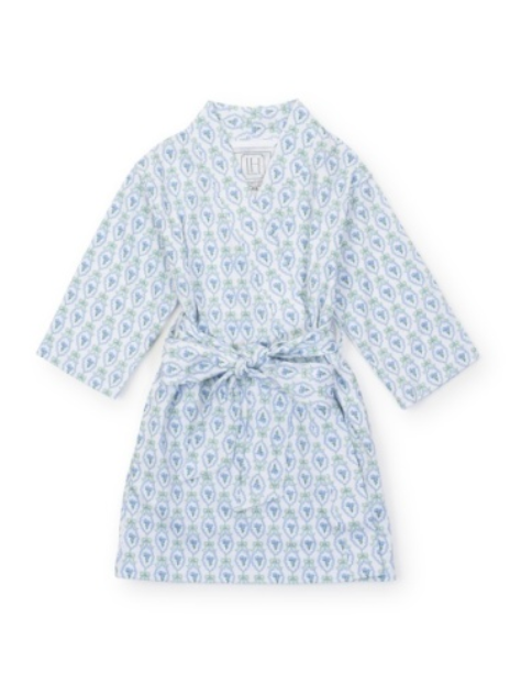 Pima cotton girls' spa wrap. Hits above the knee, and sleeves are slightly above the wrist.