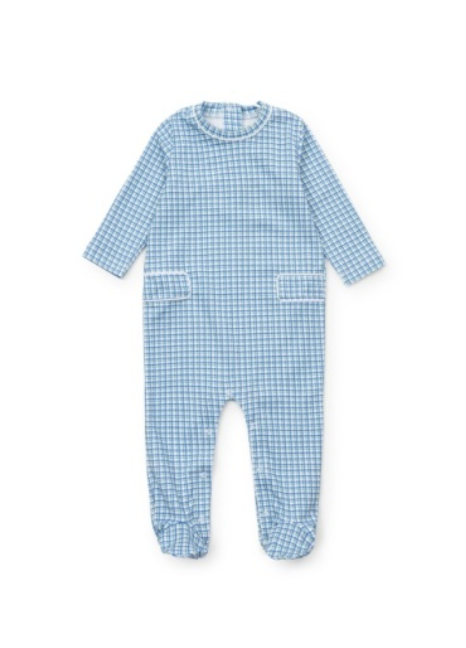 Longsleeve pima cotton footed romper with contrasting stitch detail around neck and side plackets. Snaps in stride and back of neck.