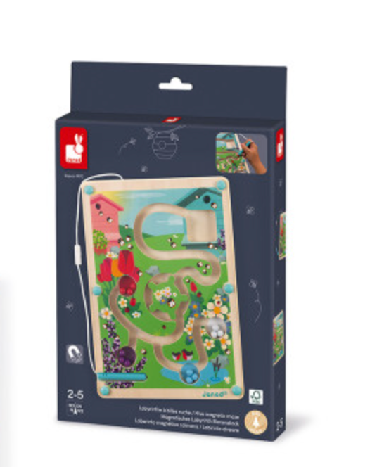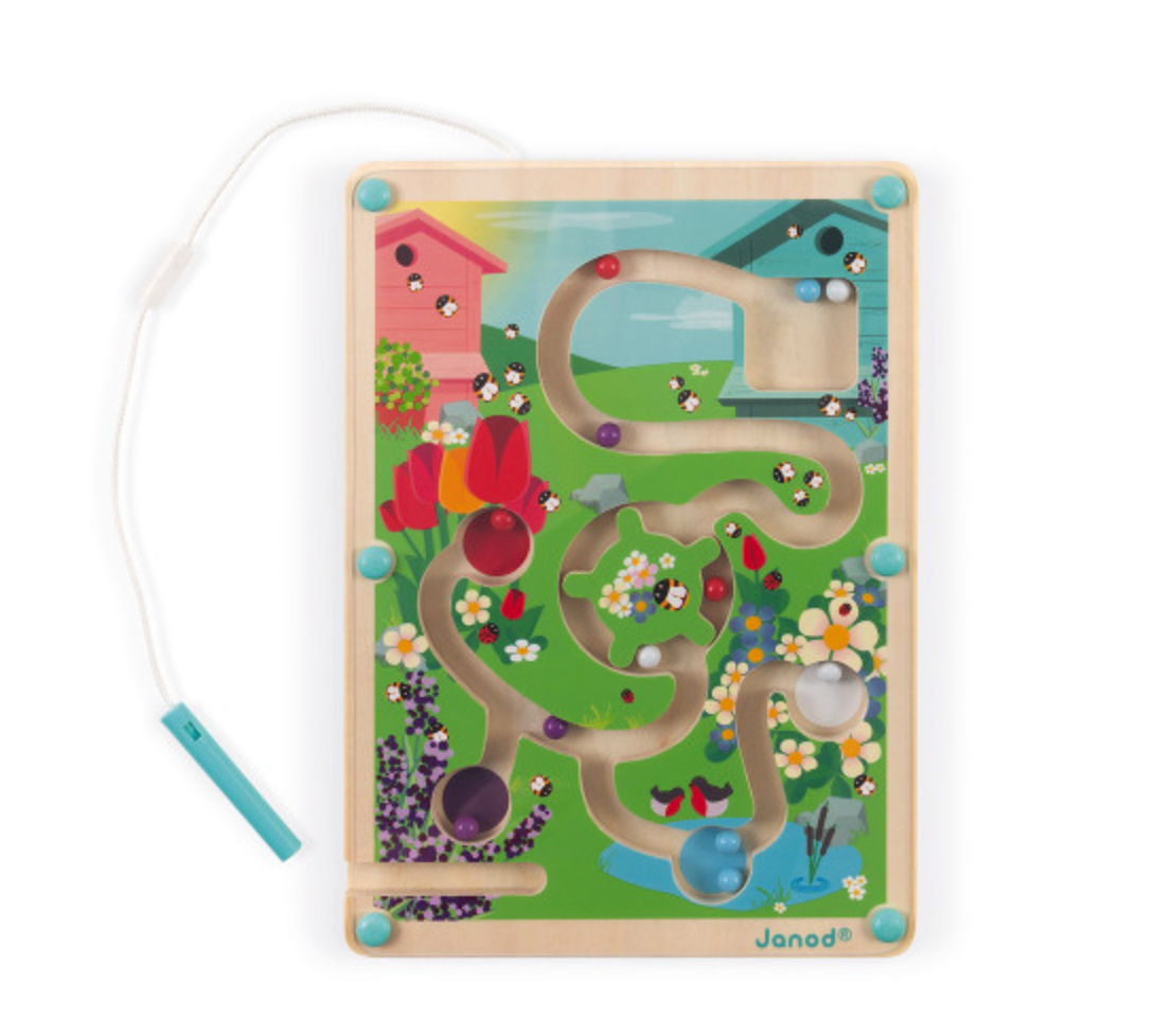 This attractive game of skill will test the motor skills of children ages 2 and up. Starting at the hut, their mission is to cross the maze and move the 16 colored balls to the right locations using the magnetic stylus! The red marbles need to go to the wild strawberries, the purple ones belong with the blackberries, etc. Remember to plot a route through the turnstile and slide the magnetic log across - otherwise you’ll get stuck! This game is perfect for working fine motor skills and teaching children how to hold a pencil properly! This game of patience and dexterity is made of wood from sustainably managed forests. Dimensions: 8.2 x 0.6 x 9.8"