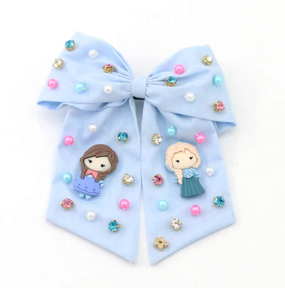 At Poppyland, a kingdom of cuteness, we present our enchanting Ice Princess Bow. Our Ice princess bow features sister princesses who love the winter! Colorful gems and pearls make this headband perfect for a princess who love snowmen! Crafted with attention to detail, this accessory adds a magical touch to any winter outfit. Perfect for young royalty who delights in the charm of snowy adventures, this headband beautifully combines elegance with playful charm.