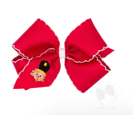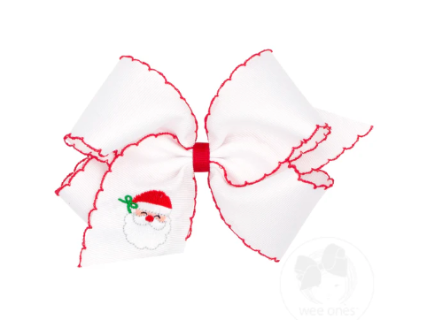 Celebrate the magic of the season with this festive grosgrain hair bow, featuring a cheerful moonstitch edge and your choice of classic Christmas embroidery: From Santa, Ginger Bread, Nutcracker, reindeer, or a holiday bow, to a twinkling tree! Available in red or white ribbon with contrasting trim, it’s the perfect finishing touch for school parties, holiday photos, and cozy winter outfits. This bow is sure to stay in her hair all day with our patented WeeStay™ no-slip hair clip.