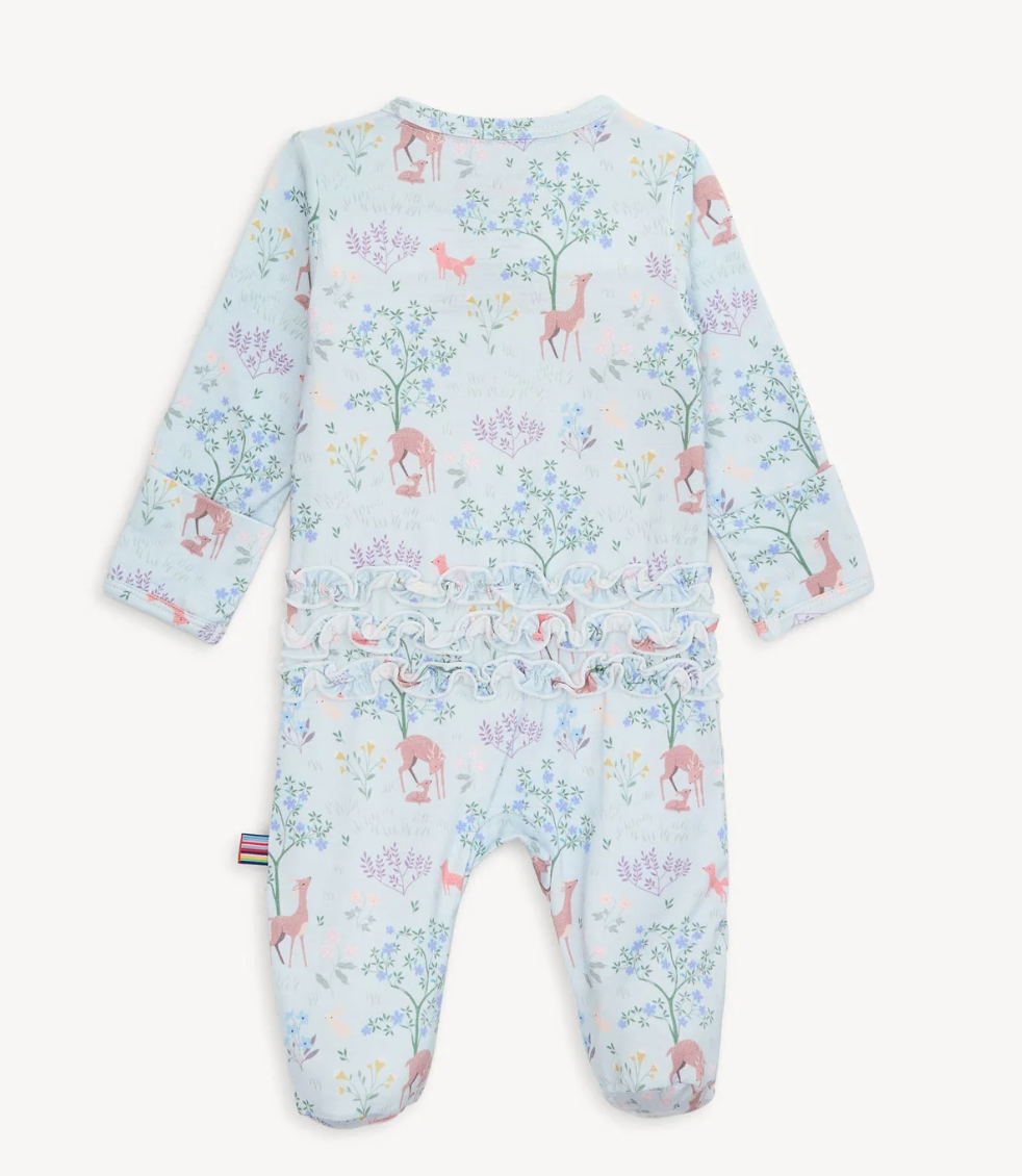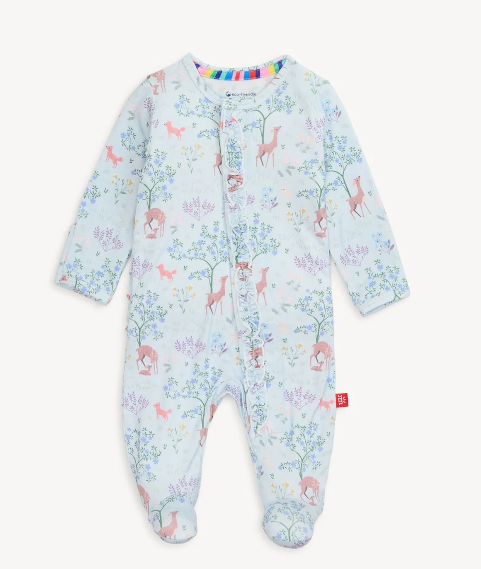 Our modal Magnetic Footie with Ruffles, designed with magnetic closures, is a quick and quiet lifesaver for all-day and middle-of-the-night diaper changes—that's up to 12 times a day (!). Made from sustainable modal, it's a silky-soft and temperature-regulating sleeper to keep your little one comfy from head to toe.
