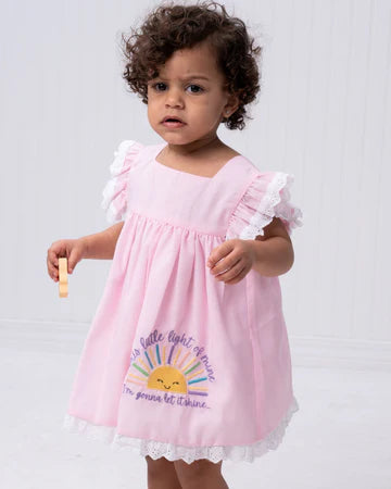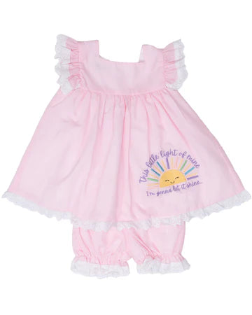 The Mave Let It Shine Bloomer Set is a delightful and charming outfit perfect for little girls who love to shine. Featuring a sweet and playful design, this set includes a soft, breathable top with delicate ruffle sleeves and an uplifting "Let It Shine" theme, paired with coordinating bloomers for a classic look. The elastic waistband ensures a comfortable fit, making it perfect for all-day wear. Whether for playdates, special occasions, or everyday outings.