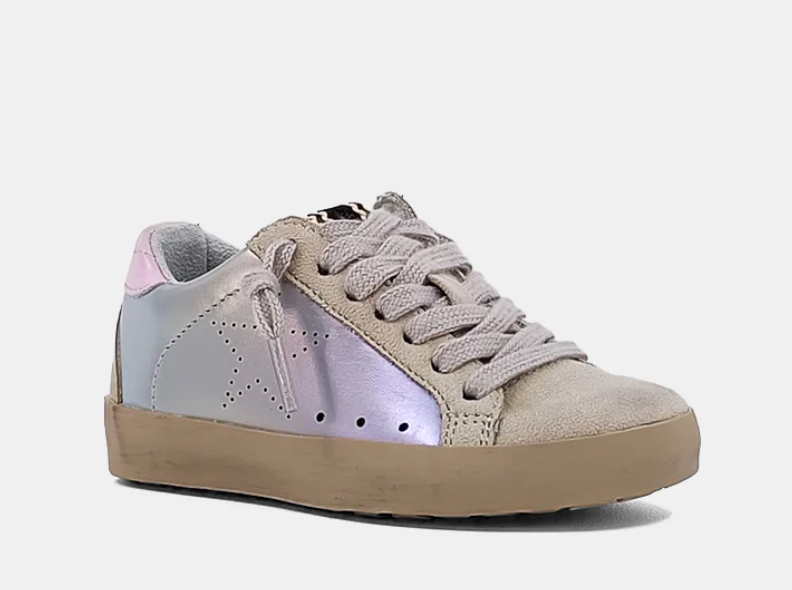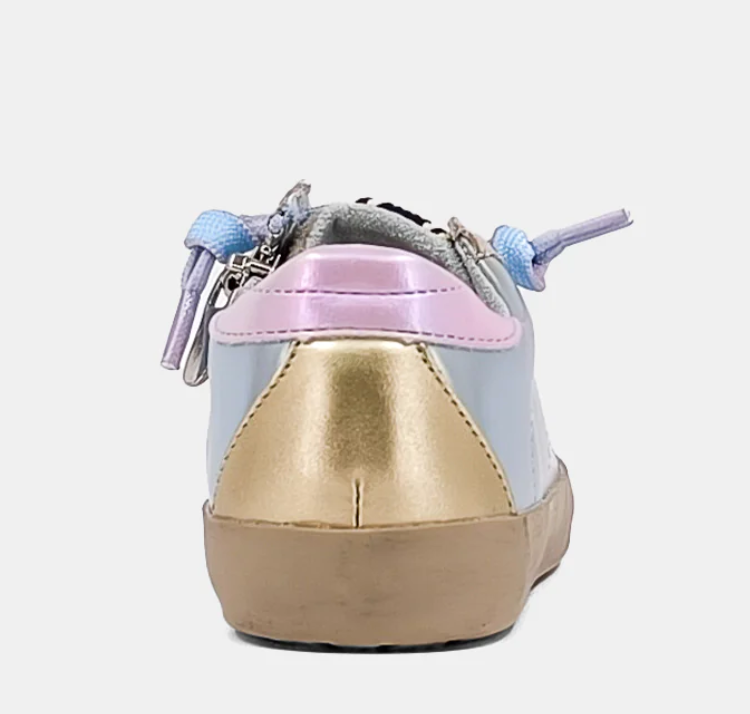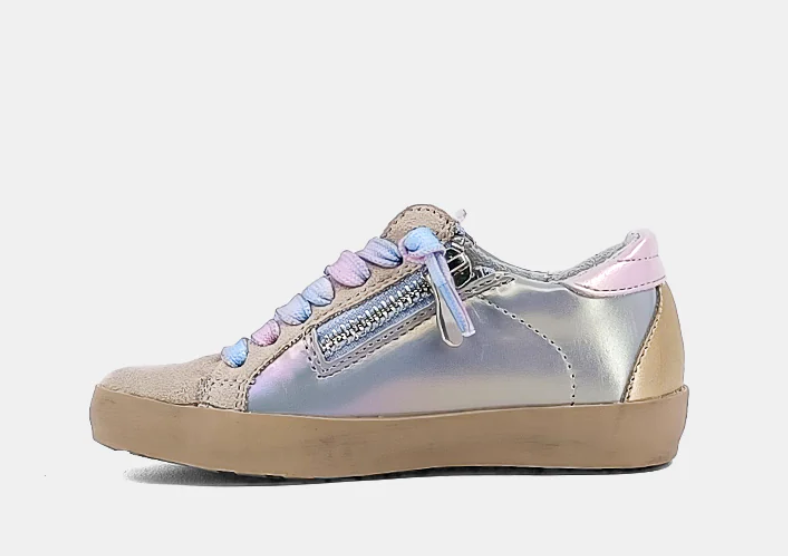 MIA is a vintage-inspired sneaker made of high-quality metallic-silver faux leather and suede, with a sturdy sole and textured panels. It's versatile and can be paired with any outfit..