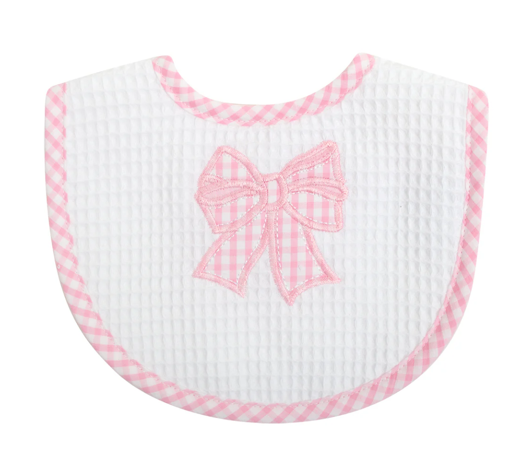 Our best-selling size bib. The front features one of our signature appliques and the back is made of 100% cotton terry. The thickness of our bibs keeps babies' clothes clean and the terry back can be used for wiping mouths and taking care of any other feeding mishaps.