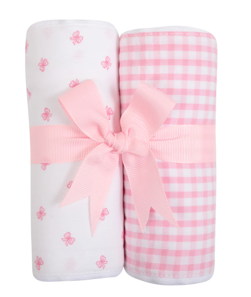 The burp cloths are one of our most practical products! Made from super absorbent, traditional cloth diapers, this set of two burp cloths is always a favorite, featuring beautiful fabrics sewn down the center of each burp. The set is presented beautifully rolled and tied with grosgrain ribbon - ready for gift giving with no extra wrapping required!