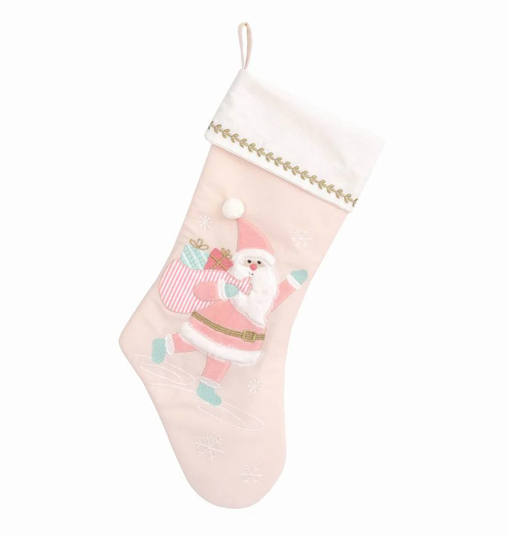All ready for Santa! Mon Ami??s festive Santa stocking in cheery pink is ready for the big man himself thanks to a jolly rendition of him delivering gifts. Generously sized for plenty of presents, our linen Christmas stocking features a wide monogrammable hem to make it truly personal. A durable loop makes it easy to hang this Santa stocking on a fireplace, staircase or bookcase. Our one-of-a-kind Christmas stocking is ideal for baby??s first Christmas or as a surprise for anyone who??s been extra-good this year.