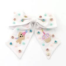 Calling all party animals! Our Birthday Girl Bow is perfect for any party or festivity. Featuring an embroidered party puppy with a birthday hat and a cupcake with a candle, this adorable accessory from Poppyland, a kingdom of cuteness, is sure to make all your wishes come true! Crafted with love and designed to bring a smile to your special day, it adds the perfect festive touch to any outfit. Celebrate in style and make every moment magical with this irresistible bow.