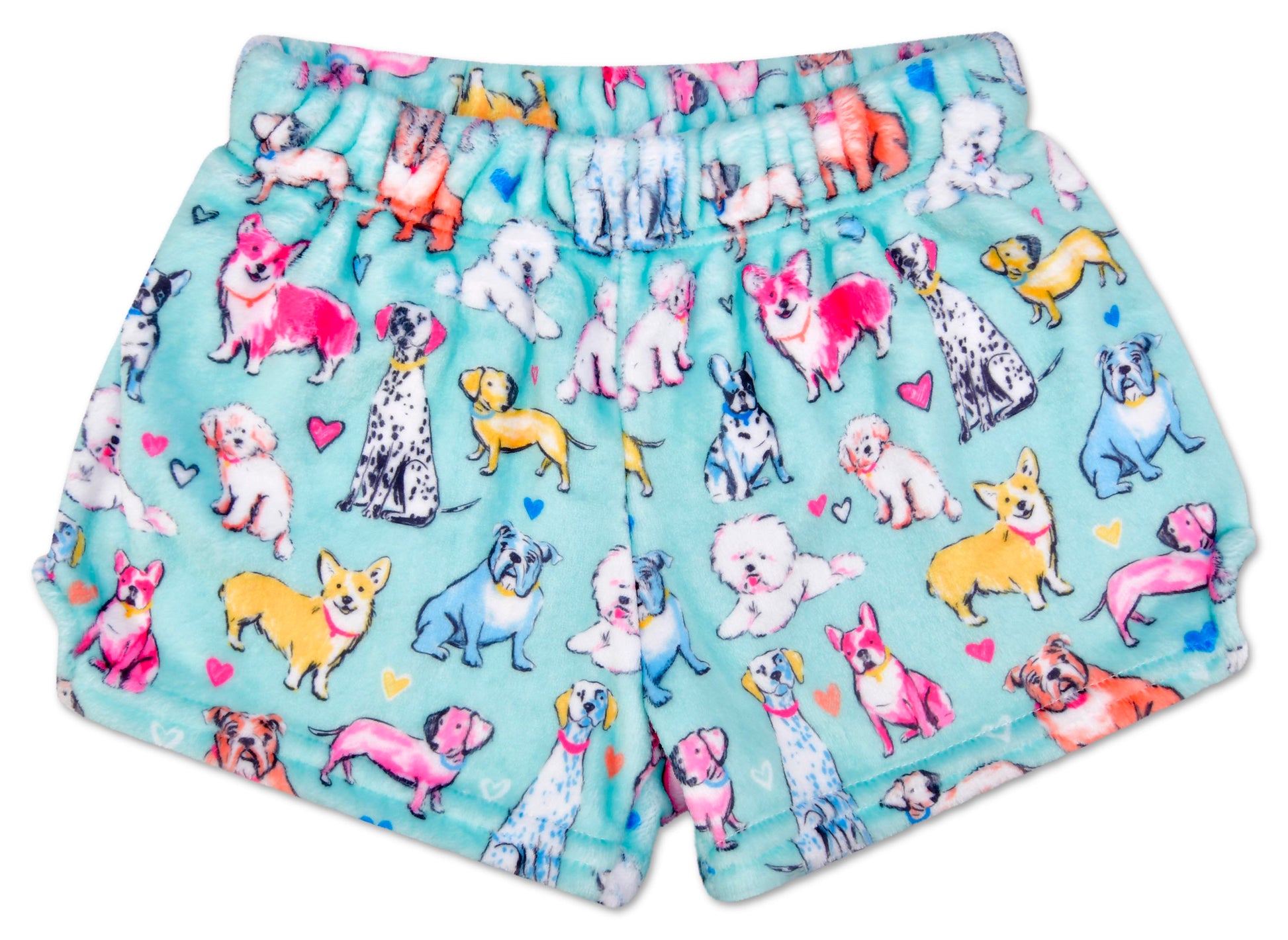 These are soft, cozy lounge or sleep shorts featuring an adorable all-over dog print. The background is a light aqua blue, and the shorts are covered with colorful illustrations of various dog breeds—including poodles, corgis, dalmatians, bulldogs, dachshunds, and more—each in playful poses. Scattered among the dogs are tiny hearts in different colors, adding an extra cute touch.