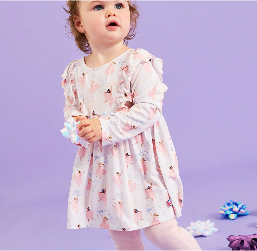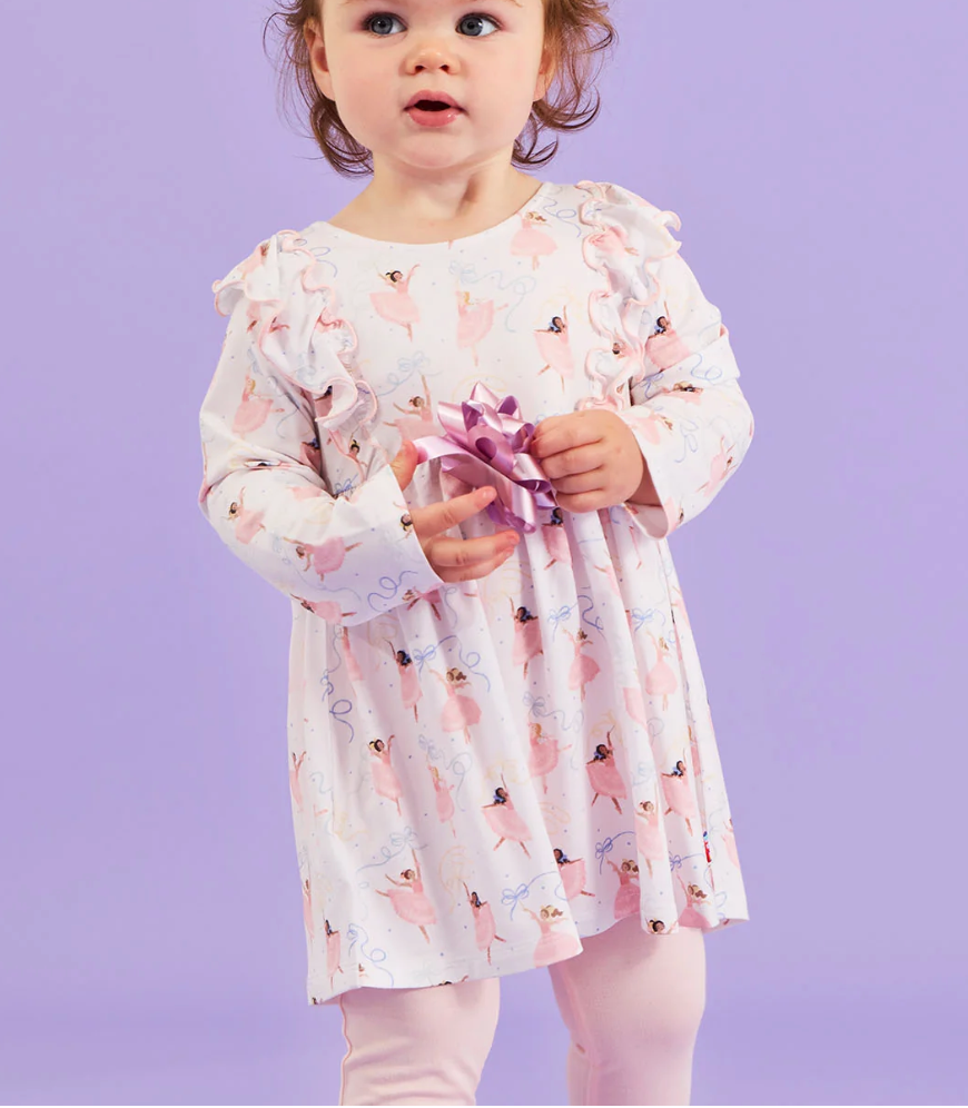 Thanks to magnetic closures that expand the neck, our modal long sleeve Magnetic Dress & Legging Set makes self-dressing so simple. It’s so comfy and fun to wear, too—we designed it in silky-soft modal with an empire waist and fluid silhouette that'll have them twirling all the time.