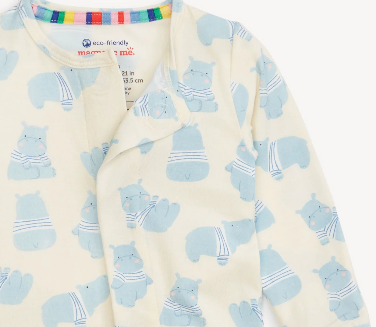 - Magnetic closures: magnets line the seam from the neck to upper thigh for sizes up to 0-3m & from neck to crotch for sizes 3-6m and up.