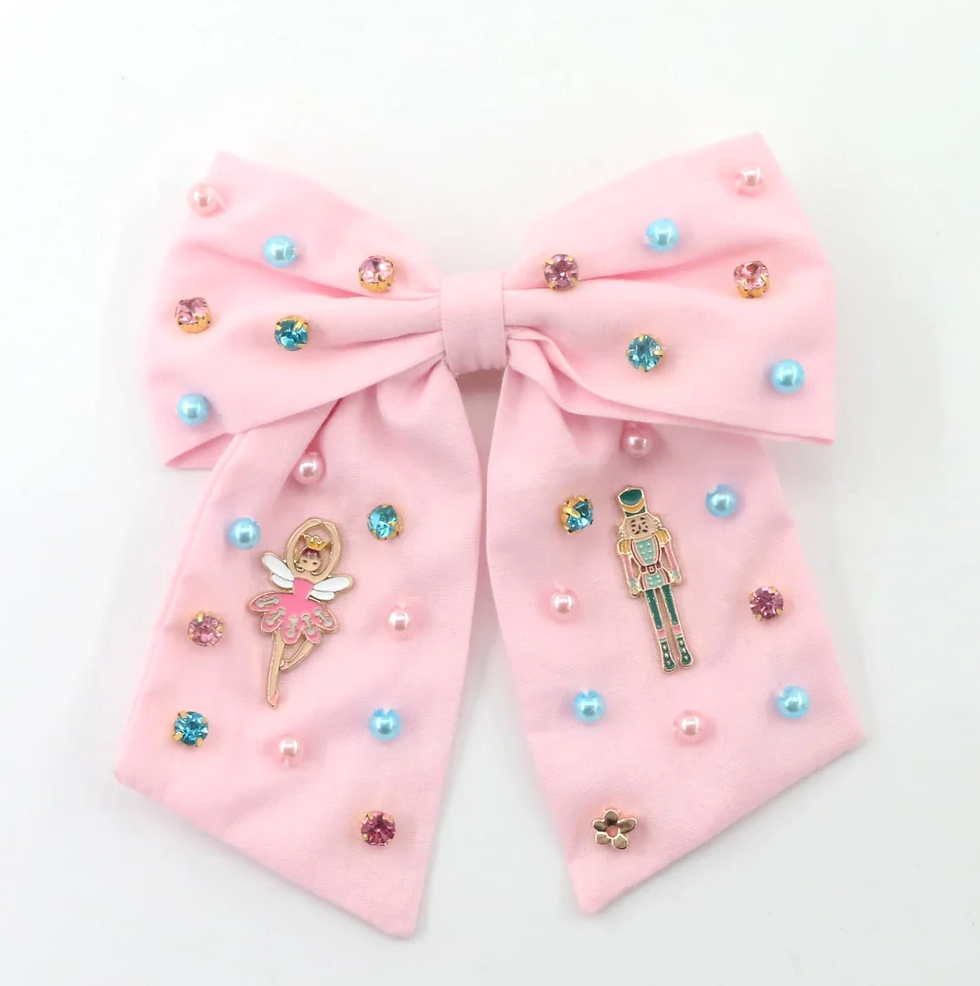Delight in the magic of the holidays with the Sugarplum Fairy Bow, now available at Poppyland! Our best selling headband now on a bow! Sugarplum Fairy features custom and exclusive charms on a pink bow with alligator clip for easy and comfortable wearing. This enchanting accessory adds a sparkle to all your festive outfits, making it a must-have in our kingdom of cuteness. Experience the joy and charm of this magical Christmas accessory, perfect for every holiday ensemble.