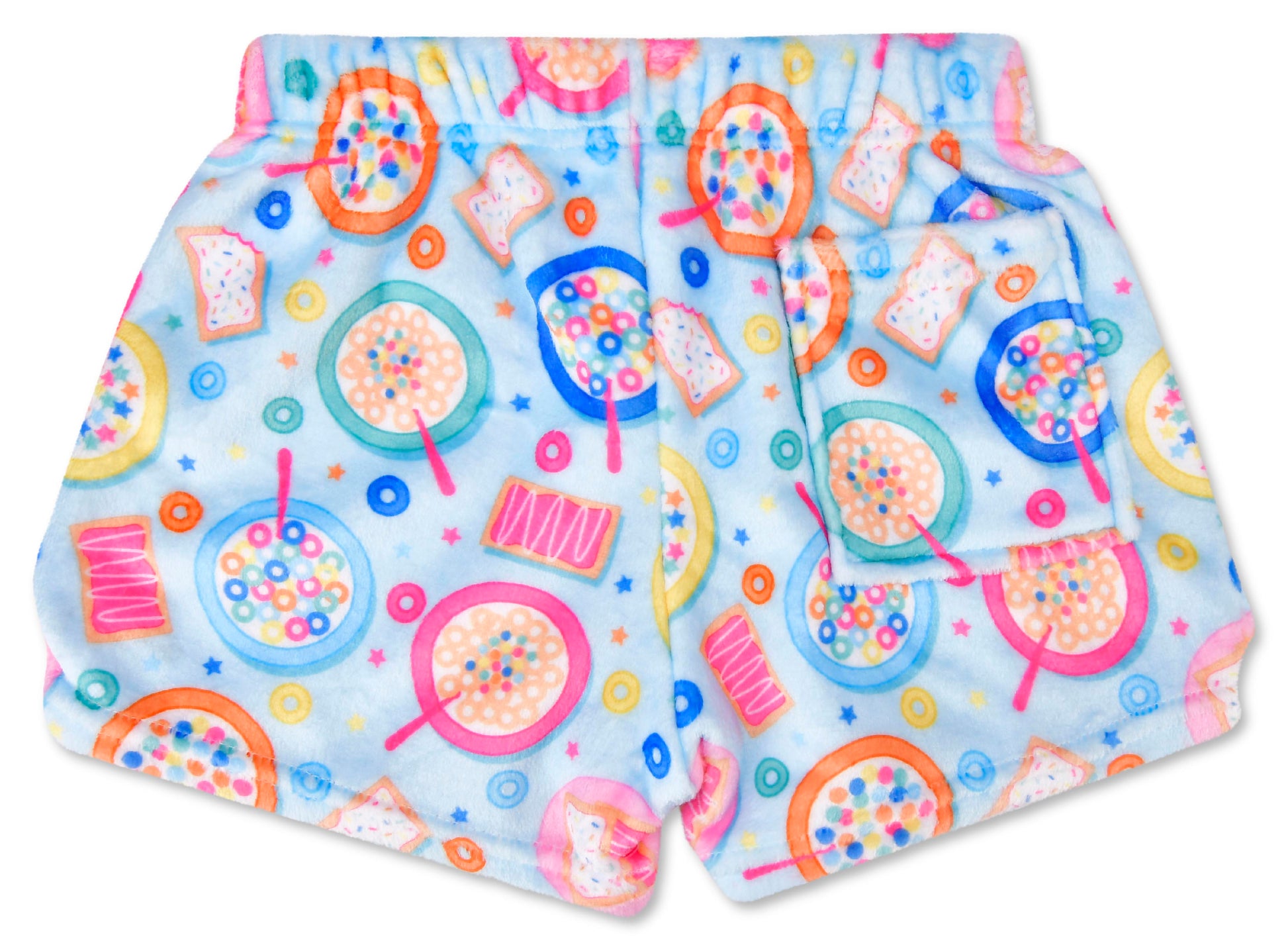 These are cozy lounge or sleep shorts with a fun breakfast-themed print. The fabric features a light blue background decorated with colorful bowls of cereal, toasters pastries (like Pop-Tarts), and other breakfast treats in bright hues of pink, orange, yellow, blue, and purple. The shorts have an elastic waistband for a snug, comfy fit and appear to be made of a soft, plush material perfect for lounging or bedtime.