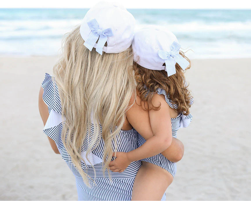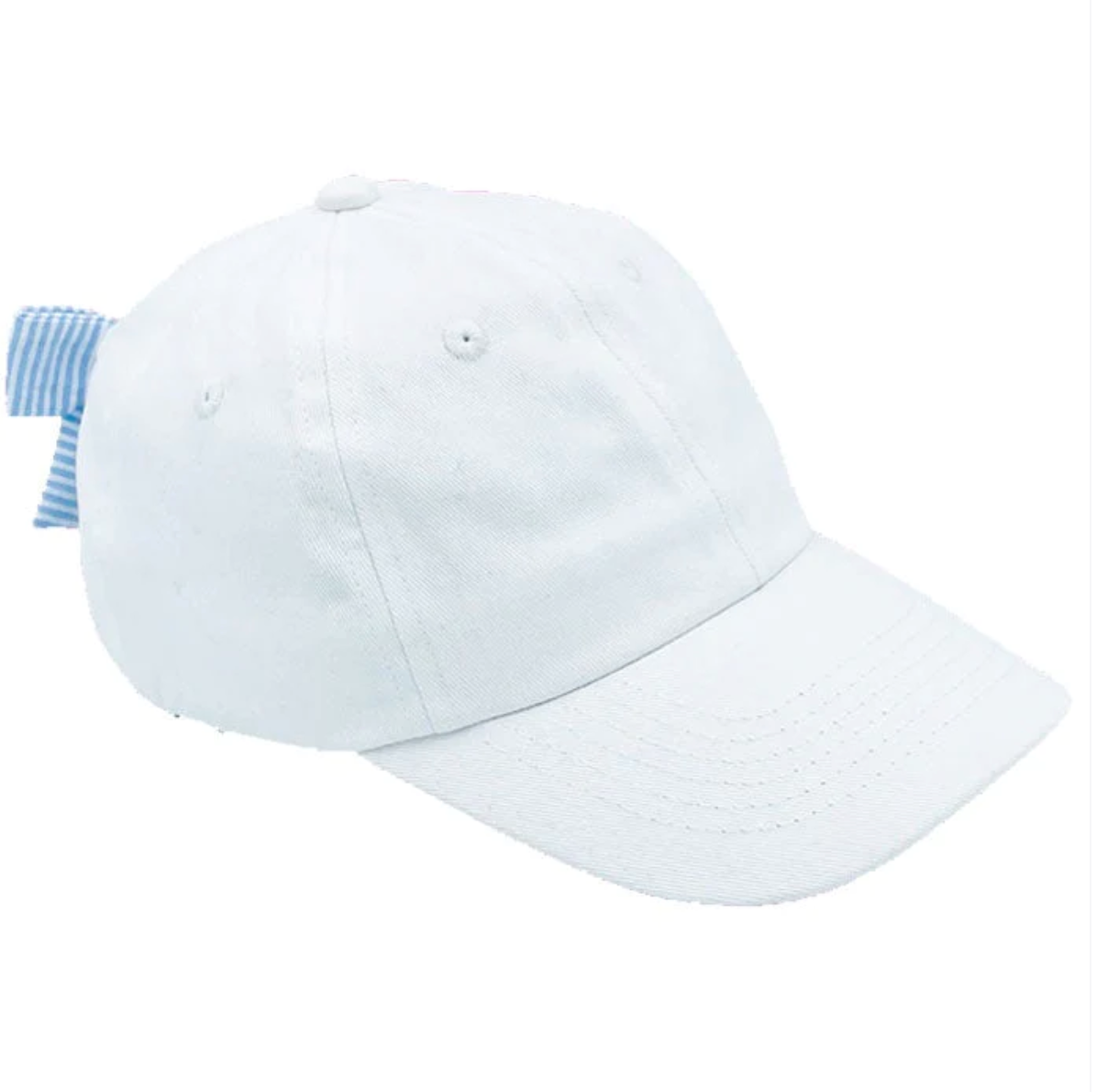 - Each hat is adorned with a seersucker blue/white skipper bow