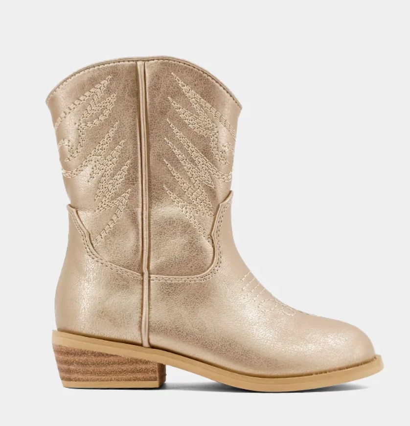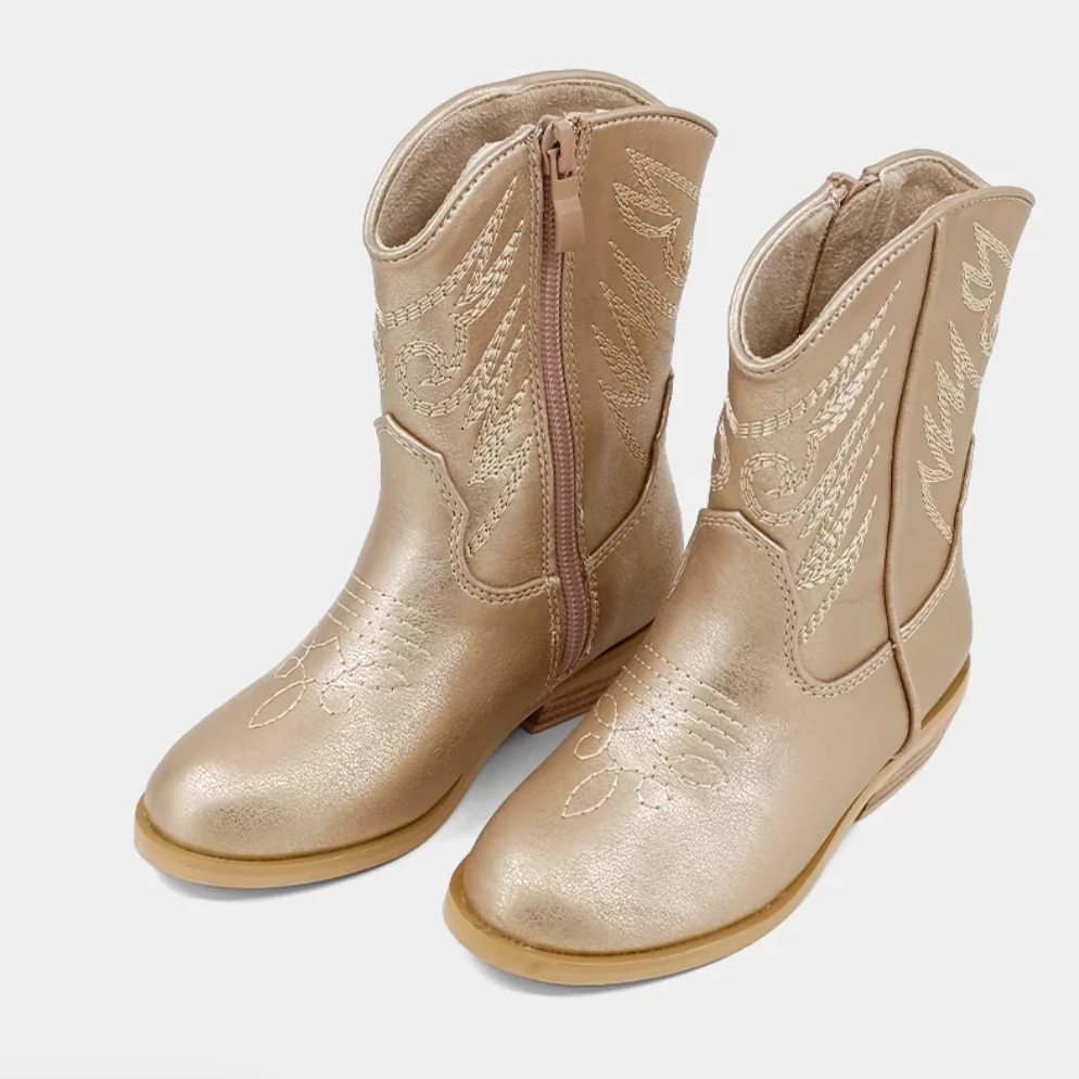 ZAHARA boots are made from a high-quality faux leather blend and suede with a golden metallic buttery finish. They feature a Western-inspired design and a small stacked heel, making them versatile for year-round wear. Let your kids make a stylish statement with these standout boots!