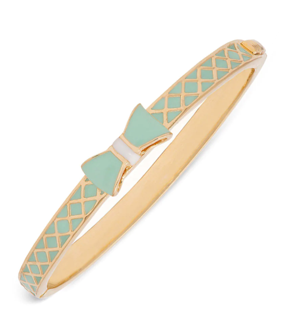 This beautiful bangle is plated with 18k gold and features a bow with hand-painted enamel. Hinged closure secures with button clasp.