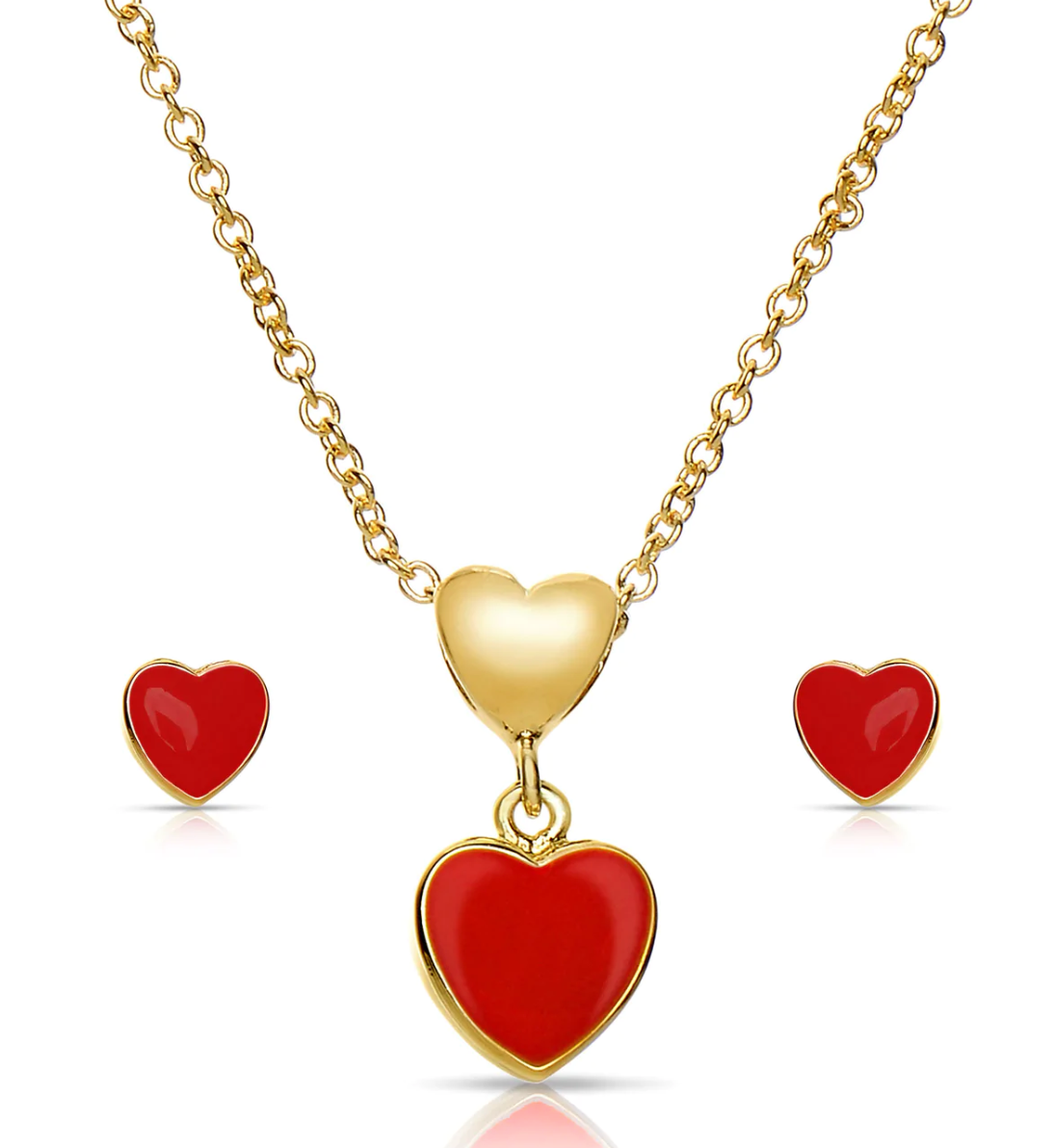 18k Gold Overlay Heart Pendant & Stud Earring Set - Red