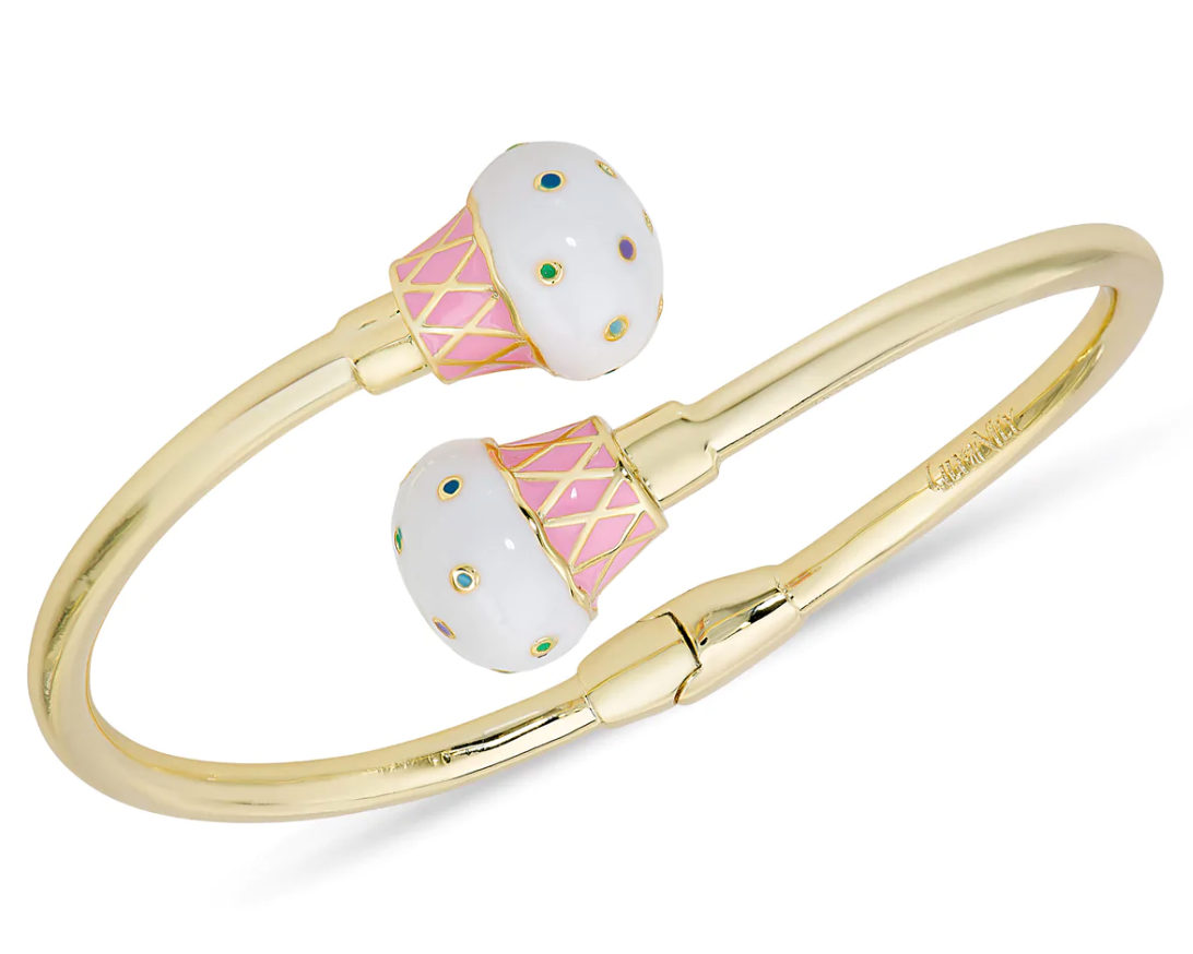 This adorable hinged bypass bangle for girls features cupcakes with hand-painted enamel. Bracelet is adorned with 18k gold plating and shines with a high-polish finish.