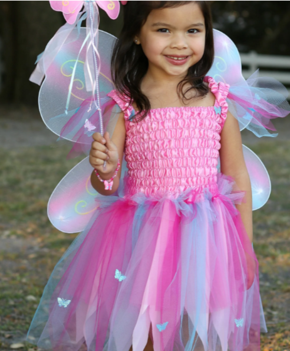This Butterfly Dress, Wings & Wand set can transform any child into a beautiful butterfly instantaneously, no work required! A ruched satin top provides sizing flexibility matched with a glimmer tulle skirt decorated with iridescent butterfly decals. 4 piece glittery wings are easily worn with satin-lined elastic straps. Finally, a matching butterfly wand to work the magic!