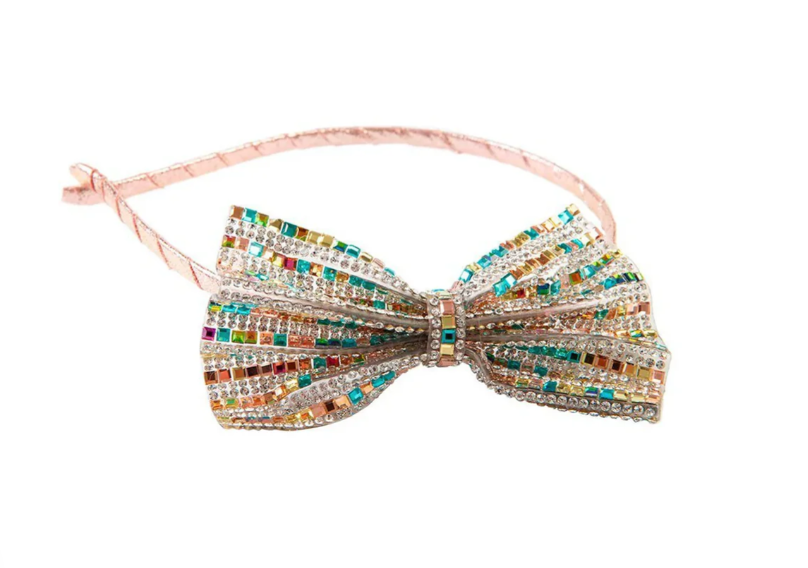 How glamourous?! This bow headband features multi-coloured gems on a pink base bow headband. The oversized bow is super cute for any outfit!