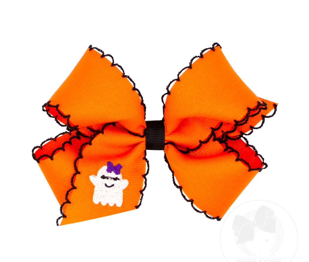 Boo-tifully festive! This vibrant orange grosgrain hair bow features a spooky-cute embroidered ghost with a purple bow, plus a contrasting black moonstitch edge for extra Halloween flair. It's the perfect pick for costume parades, school parties, and trick-or-treat fun. This bow is sure to stay in her hair all day with our patented WeeStay™ no-slip hair clip.