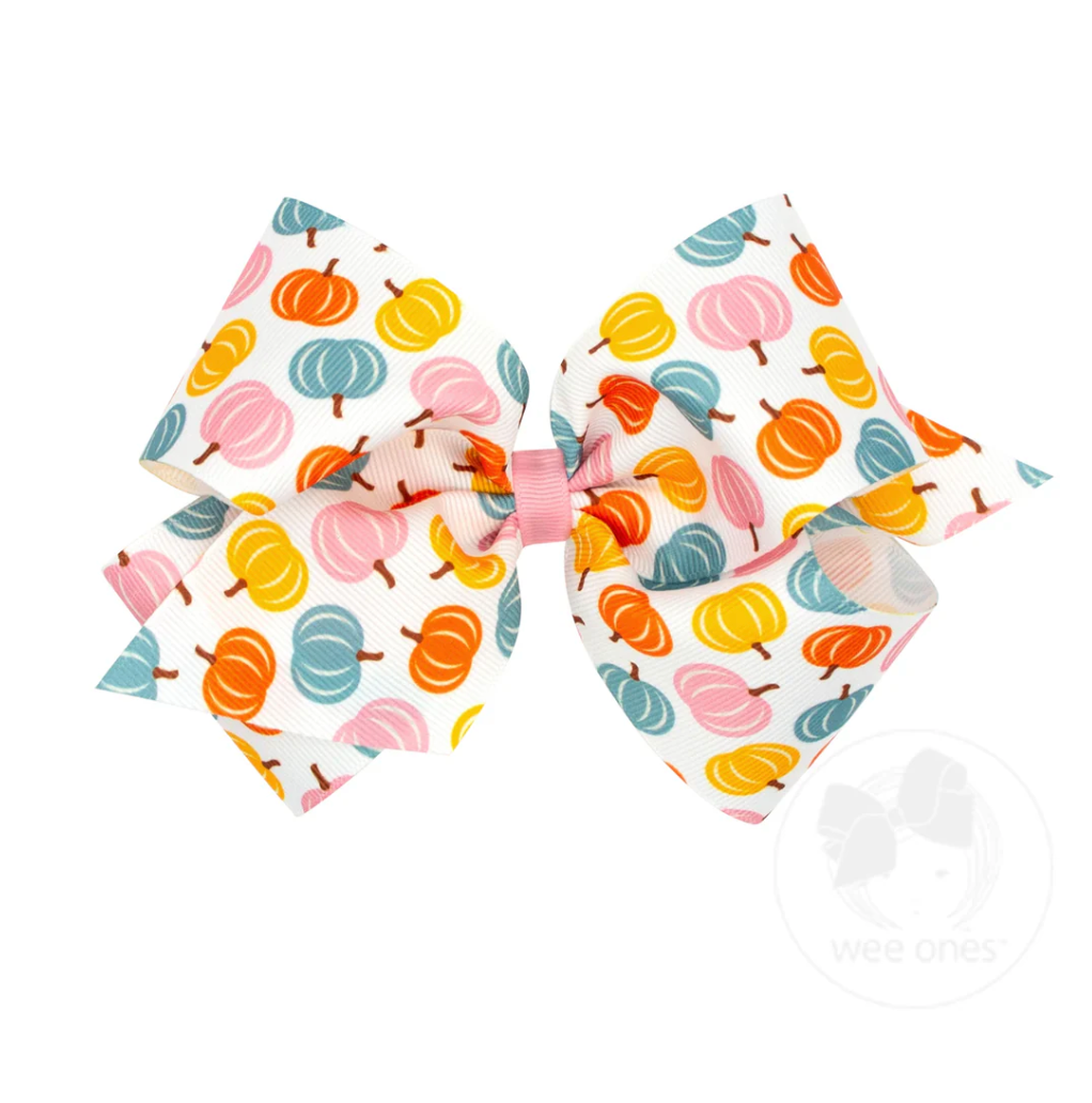 Add a playful pop of color to her fall look with this multicolor pumpkin print grosgrain hair bow! Featuring pink, yellow, blue, and orange pumpkins, this bright and cheerful accessory brings a fun twist to all her seasonal adventures. This bow is sure to stay in her hair all day with our patented WeeStay™ no-slip hair clip.