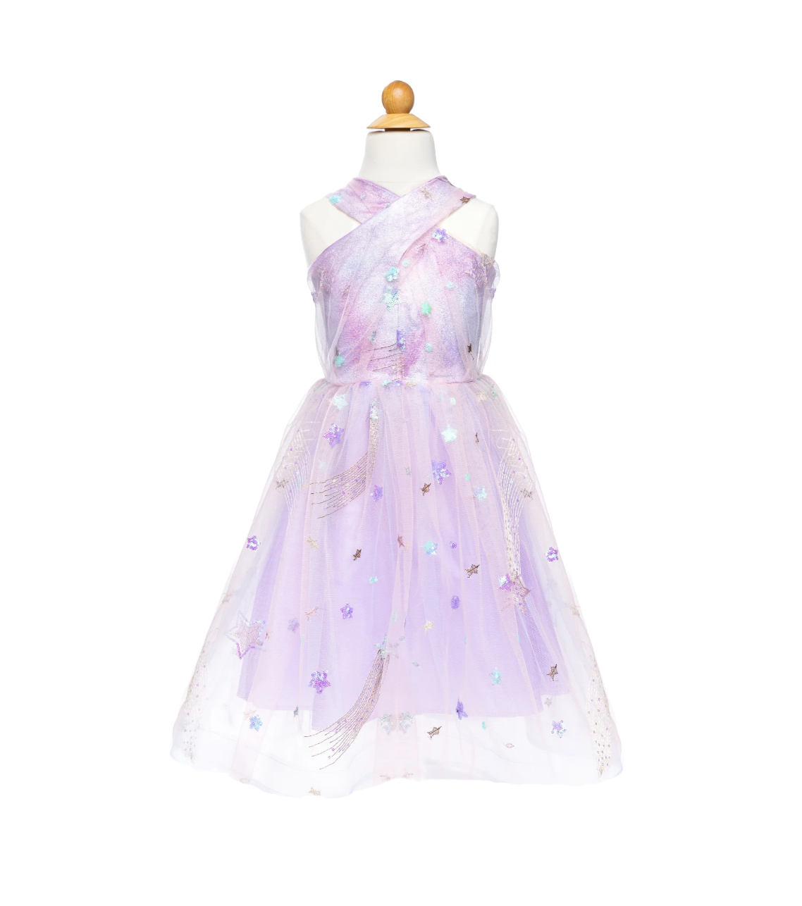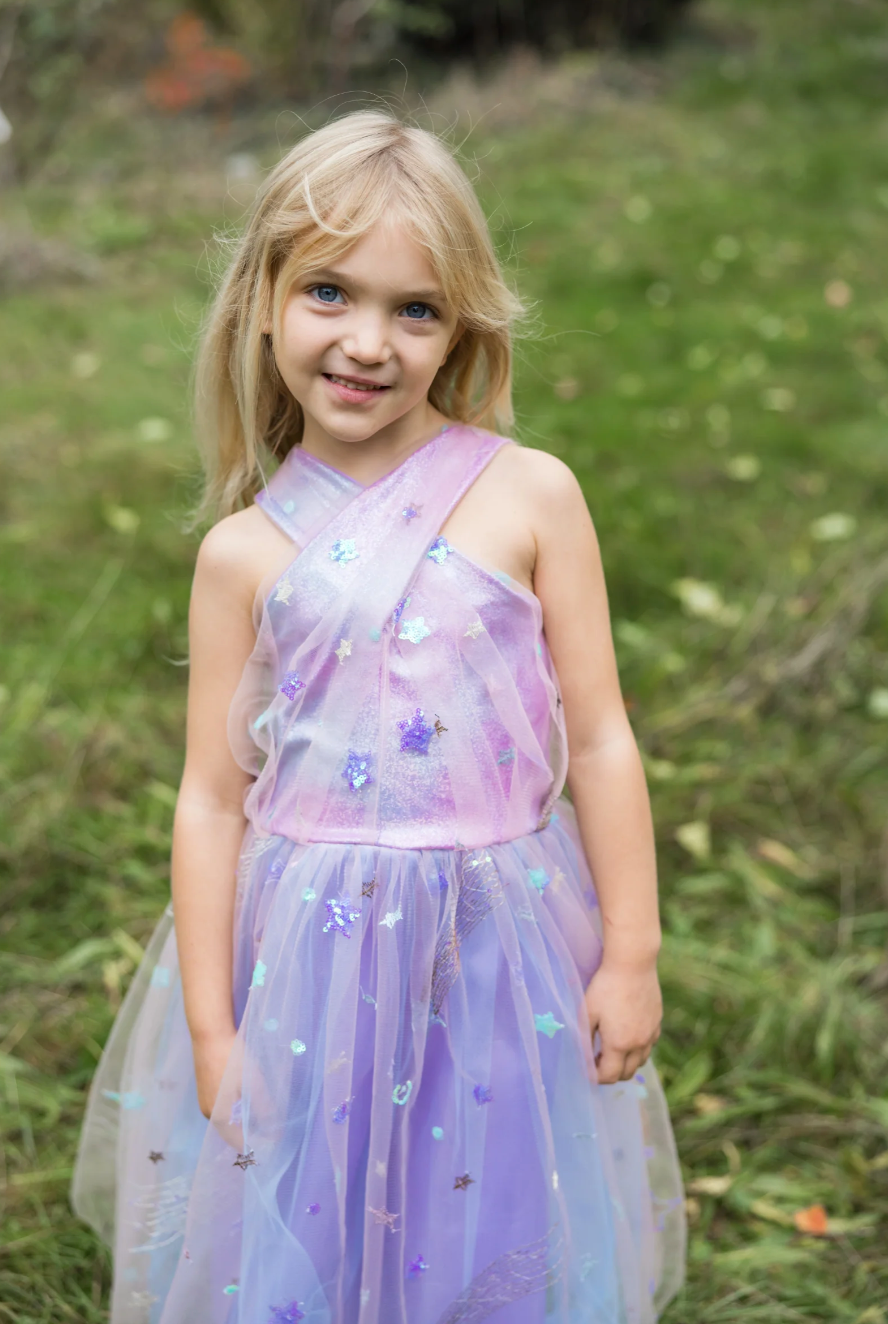 Adorned with a constellation of stars, this dress adds a touch of celestial charm to any occasion. The lilac hue brings a soft and elegant touch, while the cross-strap top adds a playful and stylish element.