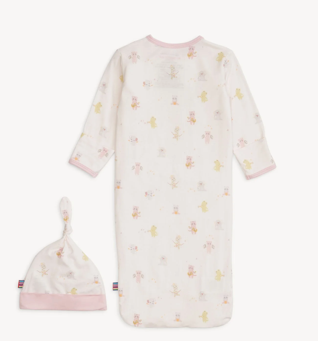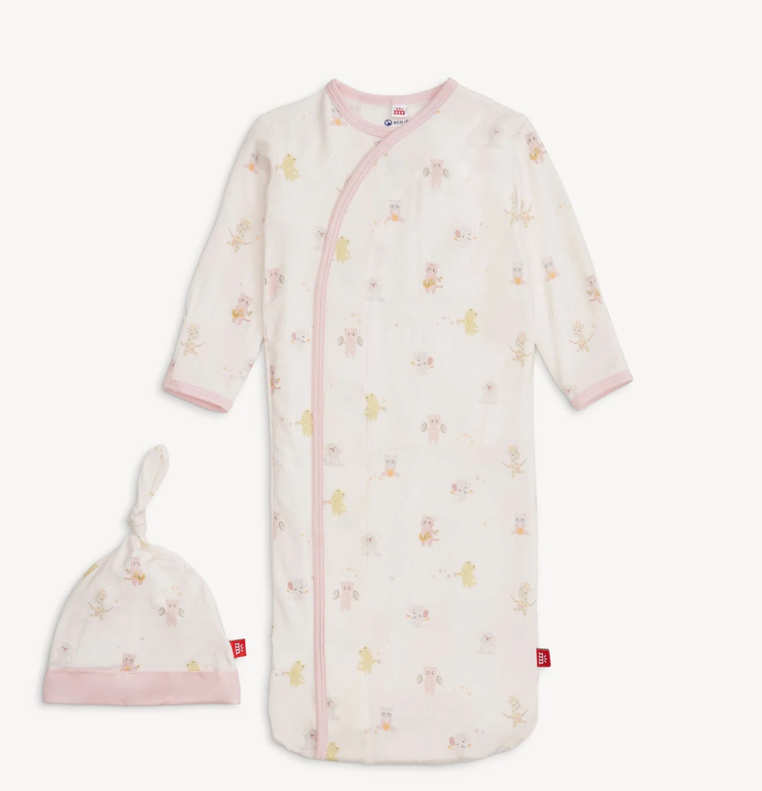 Our modal Gown & Hat Set is a newborn, late-night must-have. Magnets take diaper changes to a new level of fuss-free efficiency, while a closed bottom keeps toes and feet warm and cozy—which is mission critical during your third middle-of-the-night change. Other amazing features include the silkiest, softest modal fabric and built-in mitten cuffs.