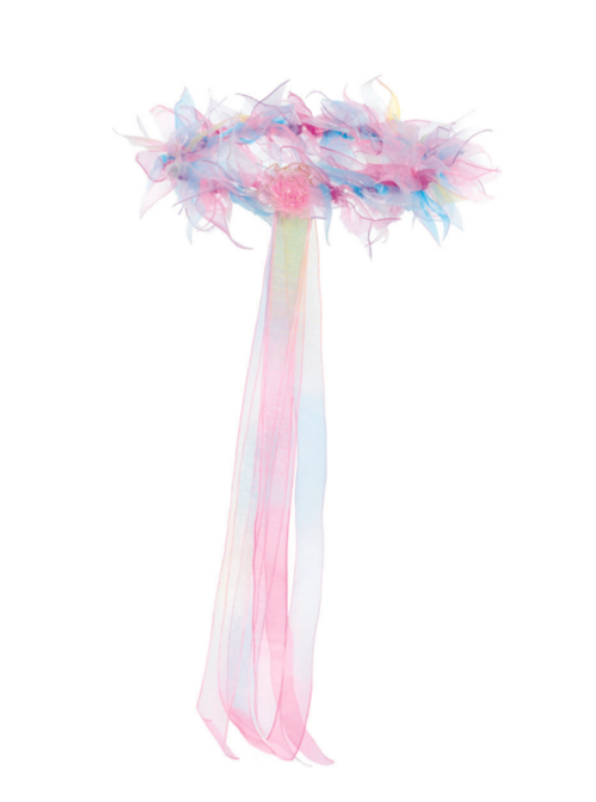 Behold: our Rainbow Halo, trimmed in multicolored organza ribbon. Wit ribbons in all colours from blue, pink, magenta and yellow, this halo is a fiesta of shimmering shining ribbons! An organza flower detail joins the trailing organza ribbon train. The perfect complement to any little Fairy's outfit.