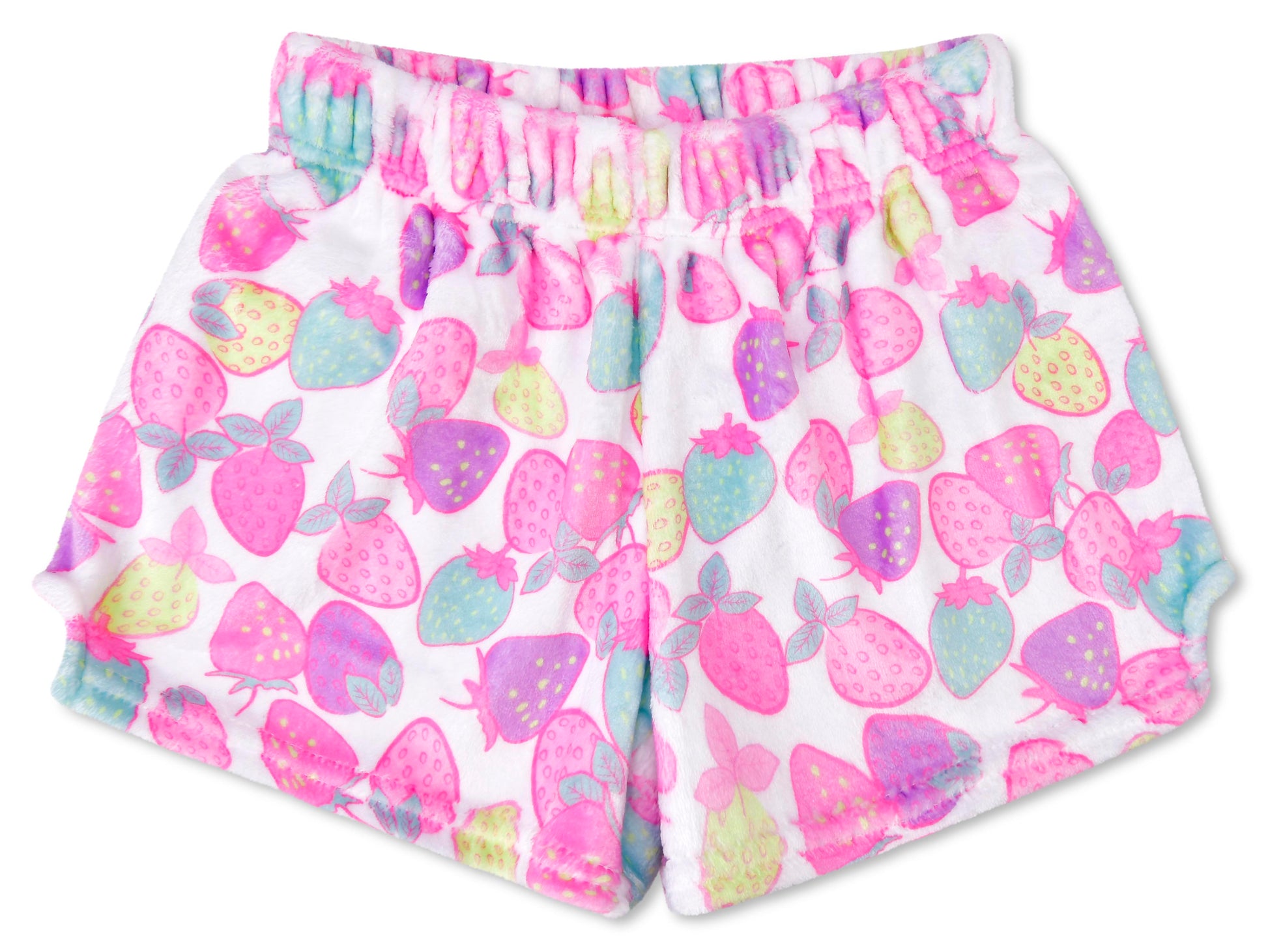 These are a pair of soft lounge or sleep shorts with a colorful strawberry print. The background is white, and the design features an all-over pattern of strawberries in pastel shades of pink, purple, mint green, yellow, and blue. The shorts have an elastic waistband for a comfortable, flexible fit and appear to be made from a cozy, plush material.