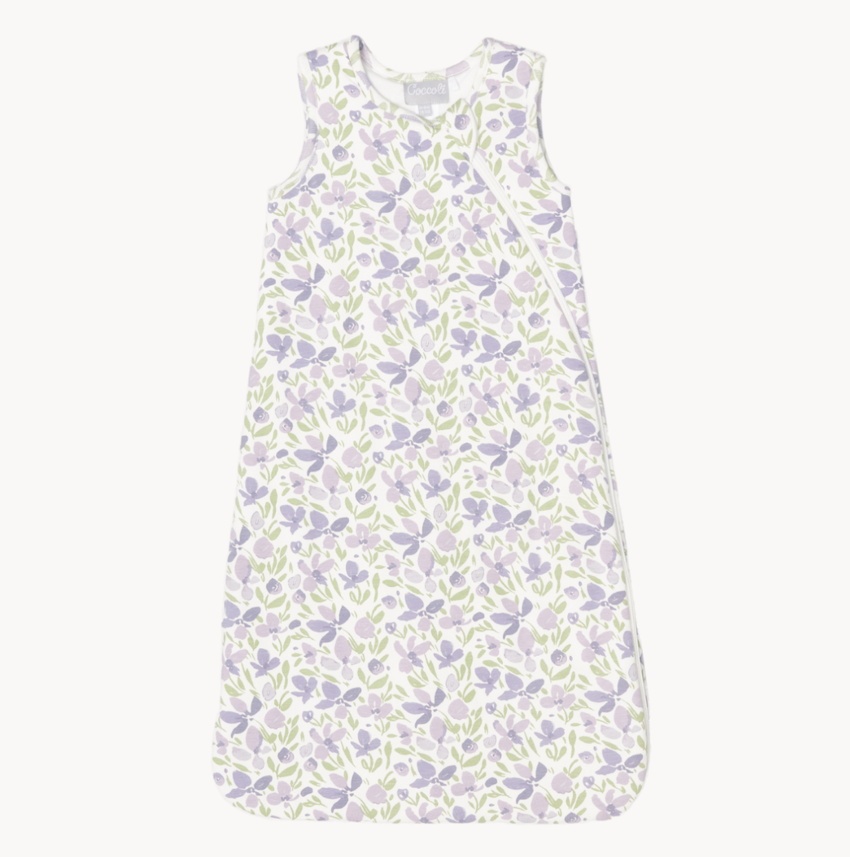 Coccoli, Baby Girl Cotton-modal 1.5 Togs Sleepsack, Color VIOLETS ON CREAM, 49% cotton/47% modal/4% spandex-knit, Comes In Sizes N/9m-18/36m, 2421, Wash inside out, Tumble dry medium. 1.5 Tog, ideal room temperature 18-21C (65 to 70 degrees F), Garment length:, N-6m measures 70cm (28in), 9m-18m measures 83cm (33in), 24m-36m measures 104cm (41.5in) . Designed in Canada.