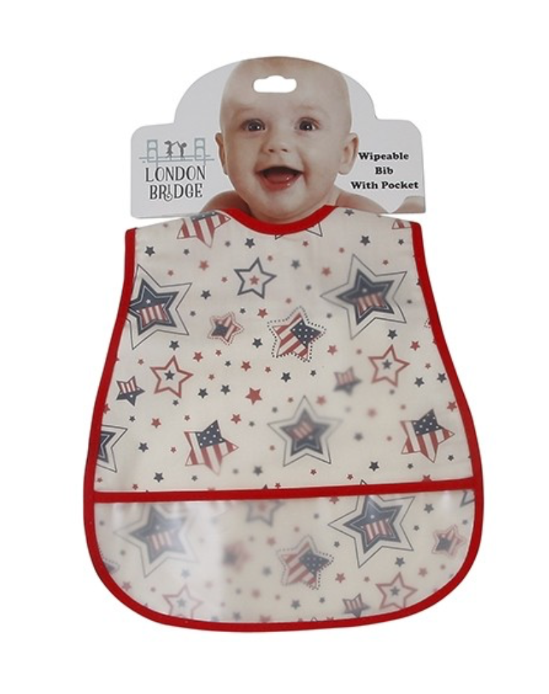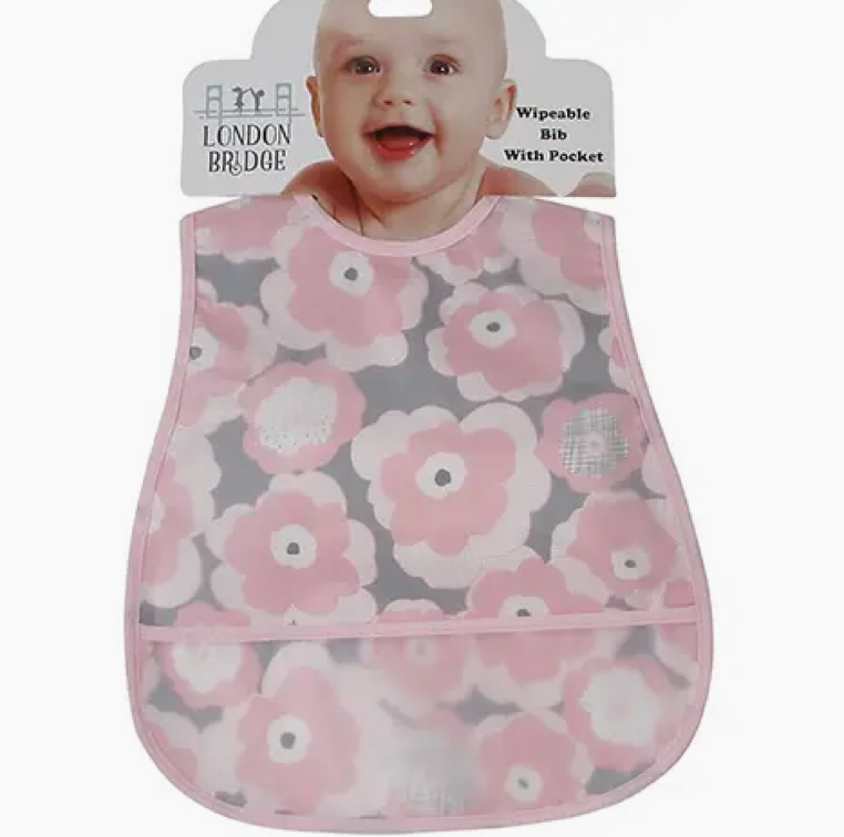 This wipeable, plastic-coated bib has a pocket to catch spilled food. 10.5” from the neck opening to the hem and 11” wide at the pocket.